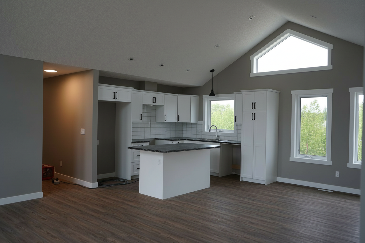 crea un ambiente calido con luces y sombras la vista de fuera es el mar respeta la distribucion de muebles solo adiciona texturas claras en la pared crea un mueble en toda la pared donde tenga shelves areas con luces zonas de storage coloca un tv y los materiales serian taupe claro pero creando contrastes madera bleach gris claro ambiente con luces y sombras detalles de alta calidad