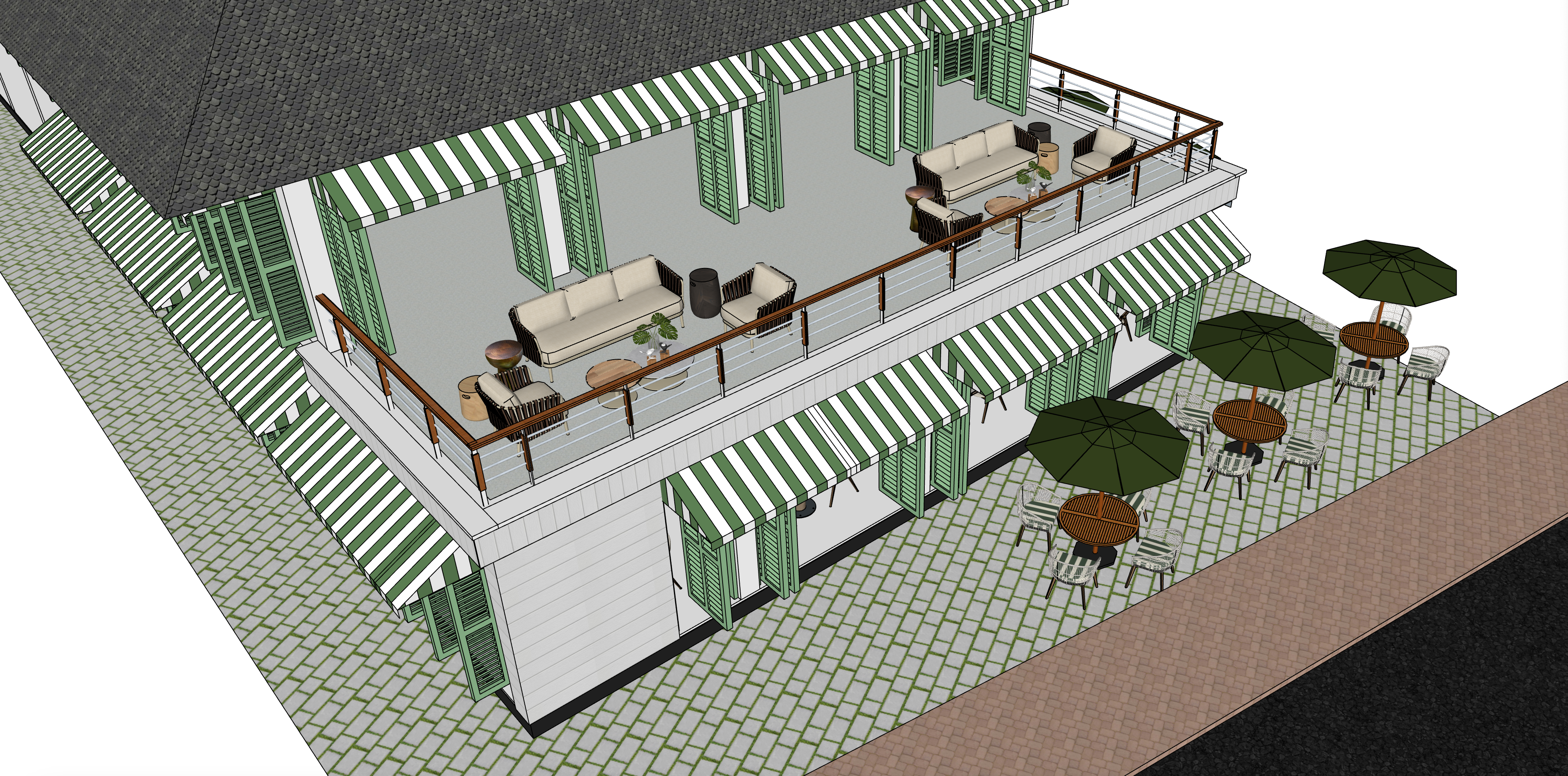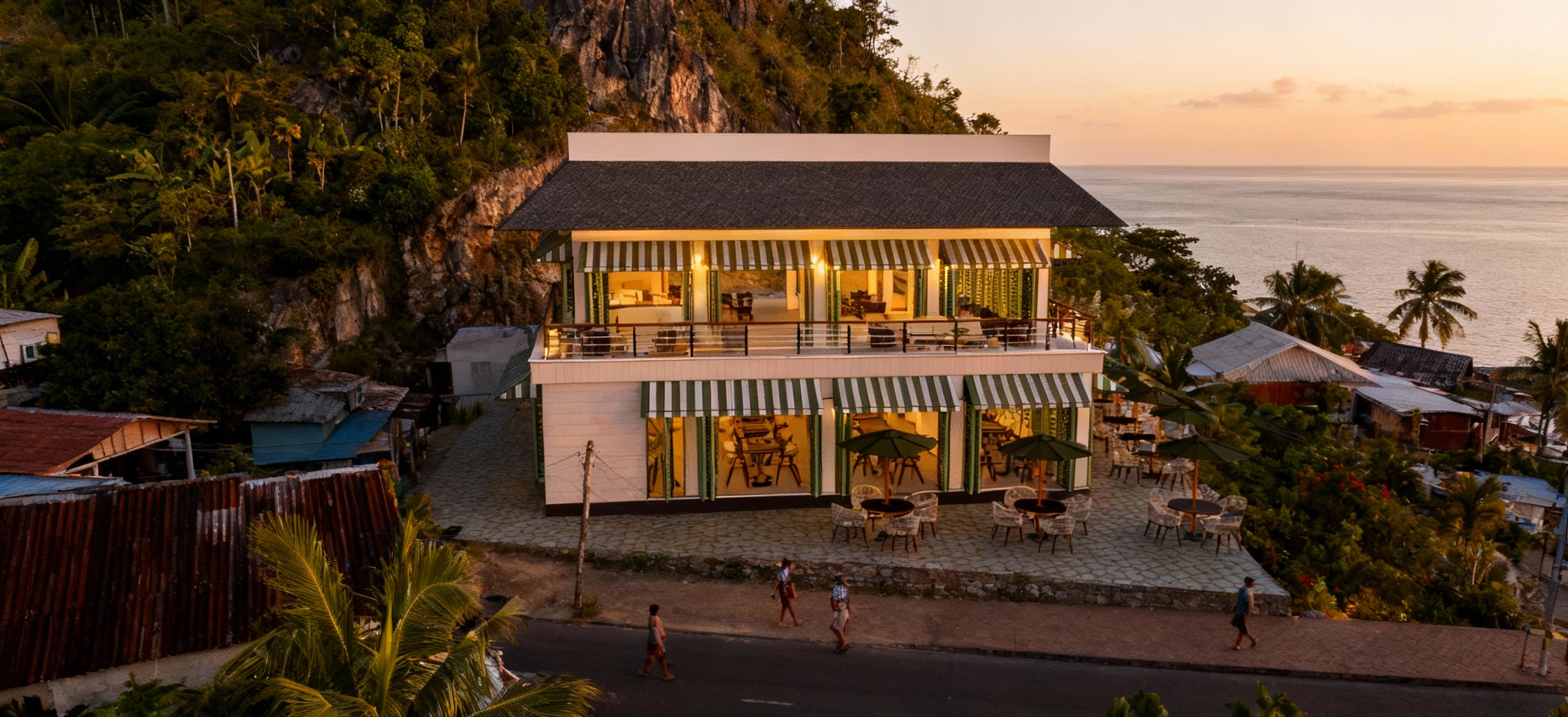 render the raw 3d architectural drawing into a realistic close up eye level view focused on the building s balcony area the project is in a hillside neighborhood of labuan bajo facing the sea from the balcony show the open view toward the ocean and the surrounding neighborhood below with soft tropical light reflecting on architectural materials include the small road and pedestrian area visible in front of the building for context