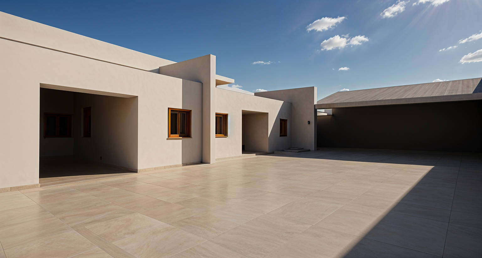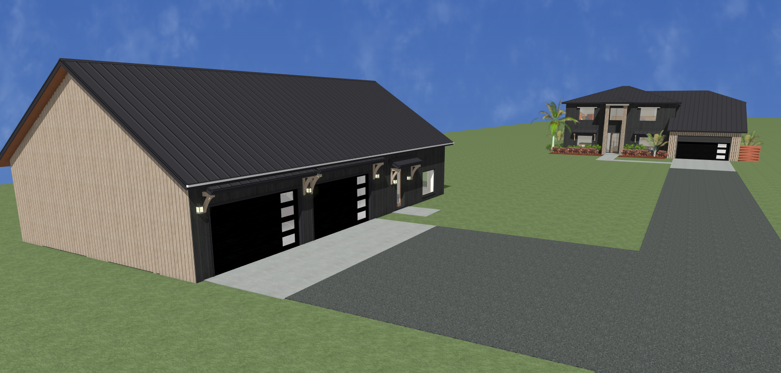 create a photo realistic image of this rendering and include a tropical landscape with a gravel driveway