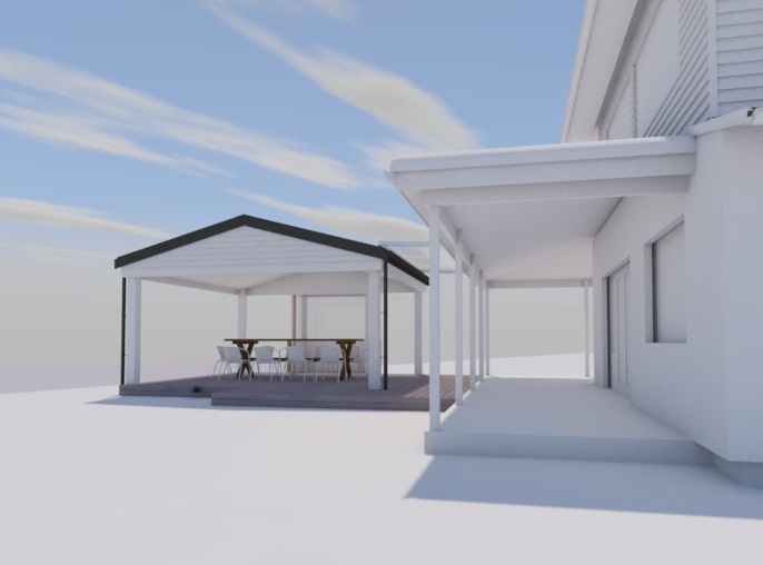 gardens around the outdoor canopy keep original building white show brick veneer on bbq units show glazed canopy in between building with brackets