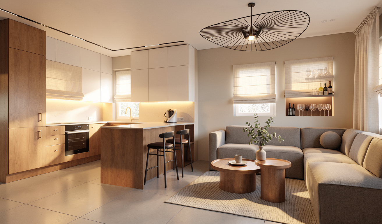 more light warm light and warm wood and glossy worktop japandi minimalistic style add warm light under the upper white cupboards add small cofeee machine on the worktop add a small japandi vase with eucaliptus leaves on a cofee table in brushed gold tray add inside in the cupboard near on the right side to the bar chair a wine glasses and fluted glass add light cream linen roman blinds only to the windows area do not change textures and other details