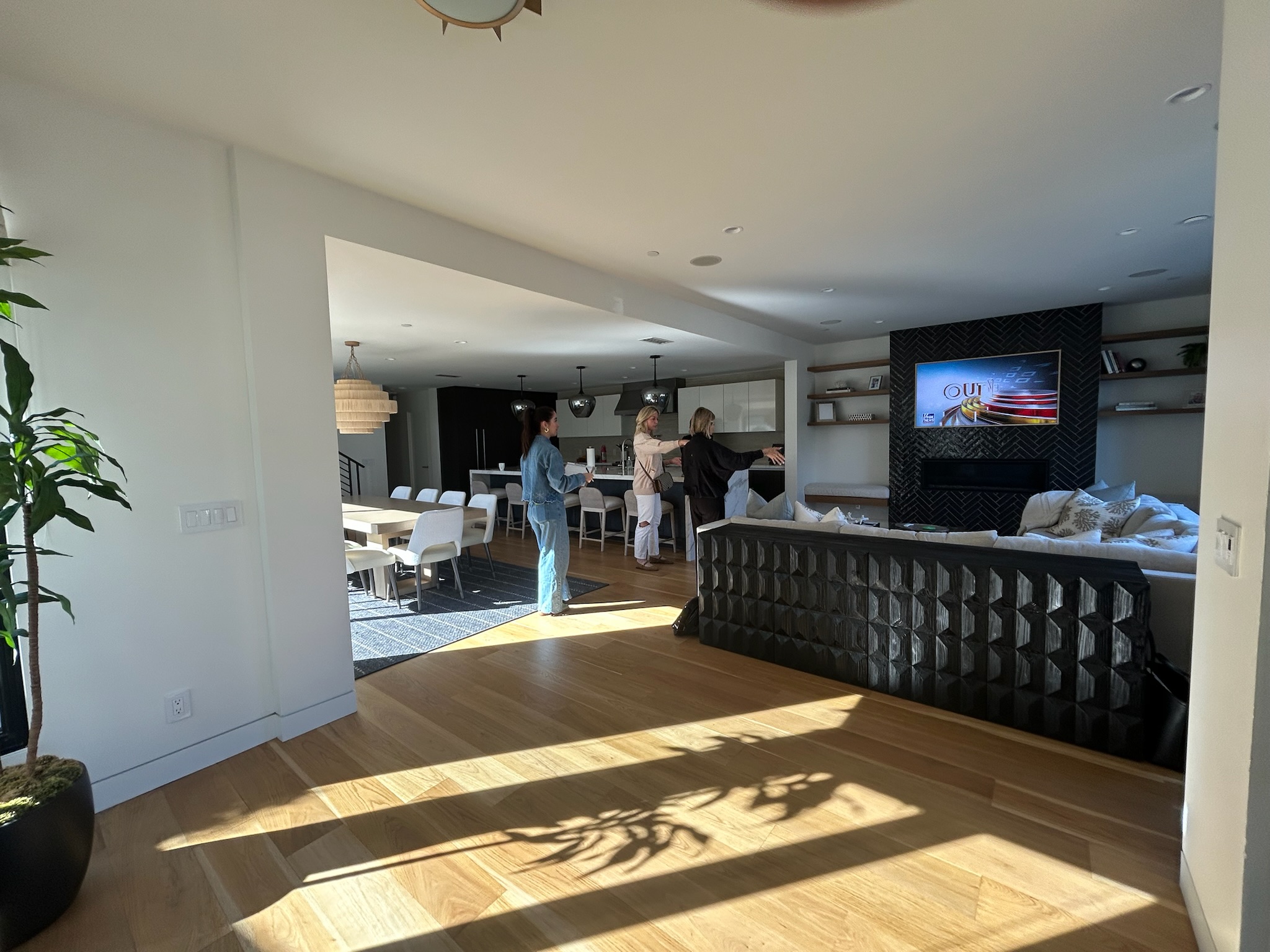 interior design concept transformation of the provided open concept living room kitchen and dining space use the reference images for style direction materiality and mood but maintain the architecture and general layout of the original space keep the existing structure and major built in elements do not redesign the architecture existing elements to preserve light oak wood flooring black framed windows and large sliding glass doors kitchen layout with black base cabinets and white upper cabinets light countertop and backsplash black herringbone tile fireplace wall built in shelves and bench seating at fireplace dining table size and placement open layout between kitchen dining and living design direction softened modern coastal clean newport beach aesthetic warm neutral palette no blue tones no literal coastal styling the goal is to soften the space and reduce the heaviness of black elements by introducing warmth texture and layered materials key design moves dining area keep dining table replace dining chairs with warm textured upholstery soft neutral fabric slightly nubby or woven keep woven chandelier and enhance its presence replace rug with subtle tonal texture low contrast kitchen keep cabinetry and layout replace bar stools with woven or mixed material stools light wood woven backs textured seats soften overall feel by adding warmth at seating level living room maintain layout replace sectional with a simpler refined sofa plinth base two seat cushions minimal back cushions straight arms warm textured neutral fabric add two sculptural accent chairs with soft curves replace coffee table with lighter material light wood or soft stone rounded or softened edges add layered pillows and textiles in tonal neutrals fireplace wall keep black tile and built ins do not redesign style shelves with warm minimal decor ceramics books organic objects add long lumbar pillows to bench seating to soften contrast overall styling incorporate woven materials soft textiles light woods and organic textures create subtle variation in materials to avoid a one note look balance contrast so black feels intentional not dominant mood warm calm layered minimal but not stark textural and inviting avoid blue tones or coastal clich s heavy black furniture glossy or overly modern finishes matching furniture sets high contrast or cold palette