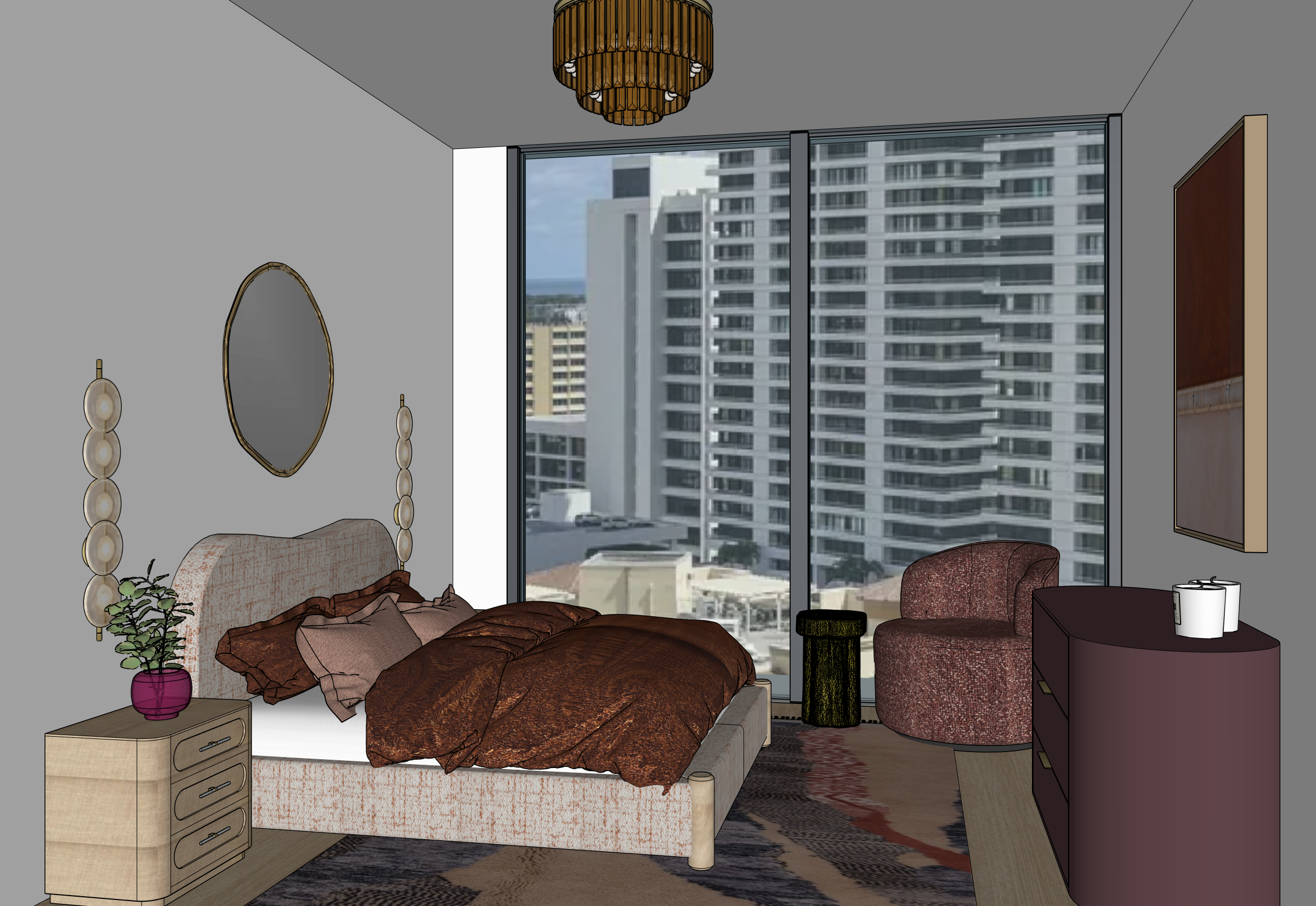 interior shot hyper realistic render of a modern cozy bedroom orange beige tweed headboard rust velvet bedding dusty rose pillows wine red boucle chair with green amber table moroccan multicolor rug wood brass nightstands plum dresser amber glass chandelier two agate stone sconces floor to ceiling windows with city view warm natural lighting soft textures luxe contemporary style