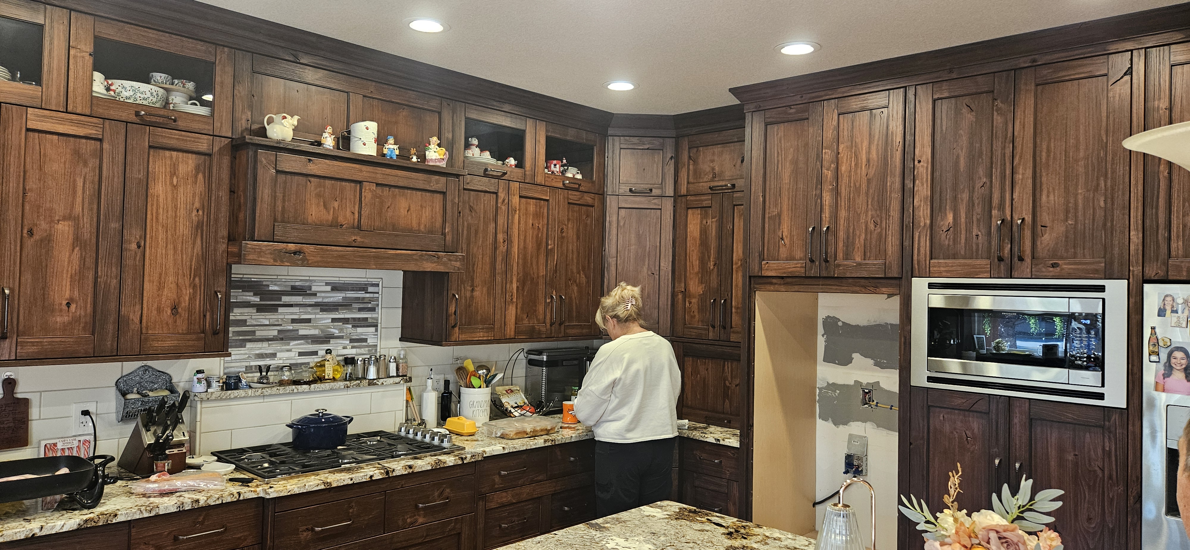 create a cozy rustic kitchen scene with warm wooden cabinets use a rich walnut color for the cabinets and shelves add a modern stainless steel built in oven for contrast the countertop should be a speckled granite with earthy tones include a tiled backsplash in shades of grey and off white for a subtle texture the ambiance should be warm and inviting with soft lighting overhead incorporate some ceramic figurines on the top shelves in pastel colors for a charming touch place a bouquet of soft pastel flowers on the counter adding a touch of freshness to the scene