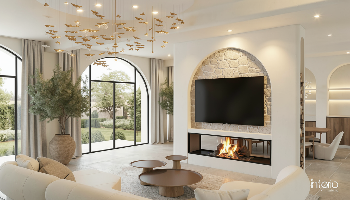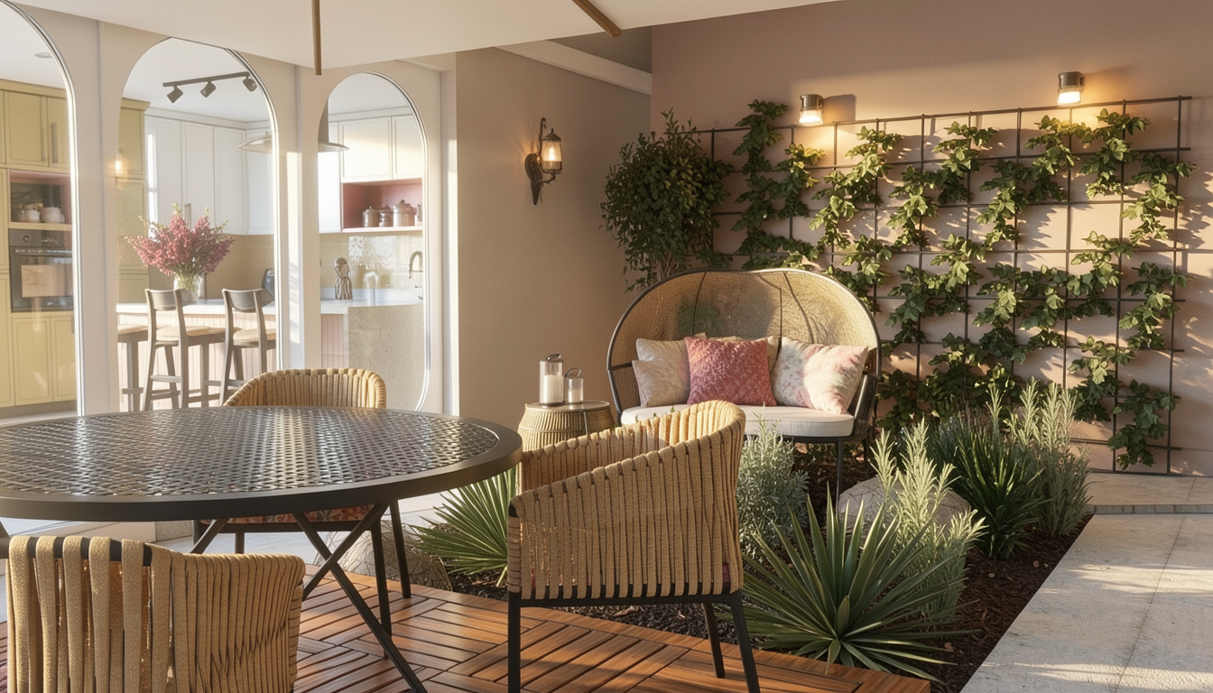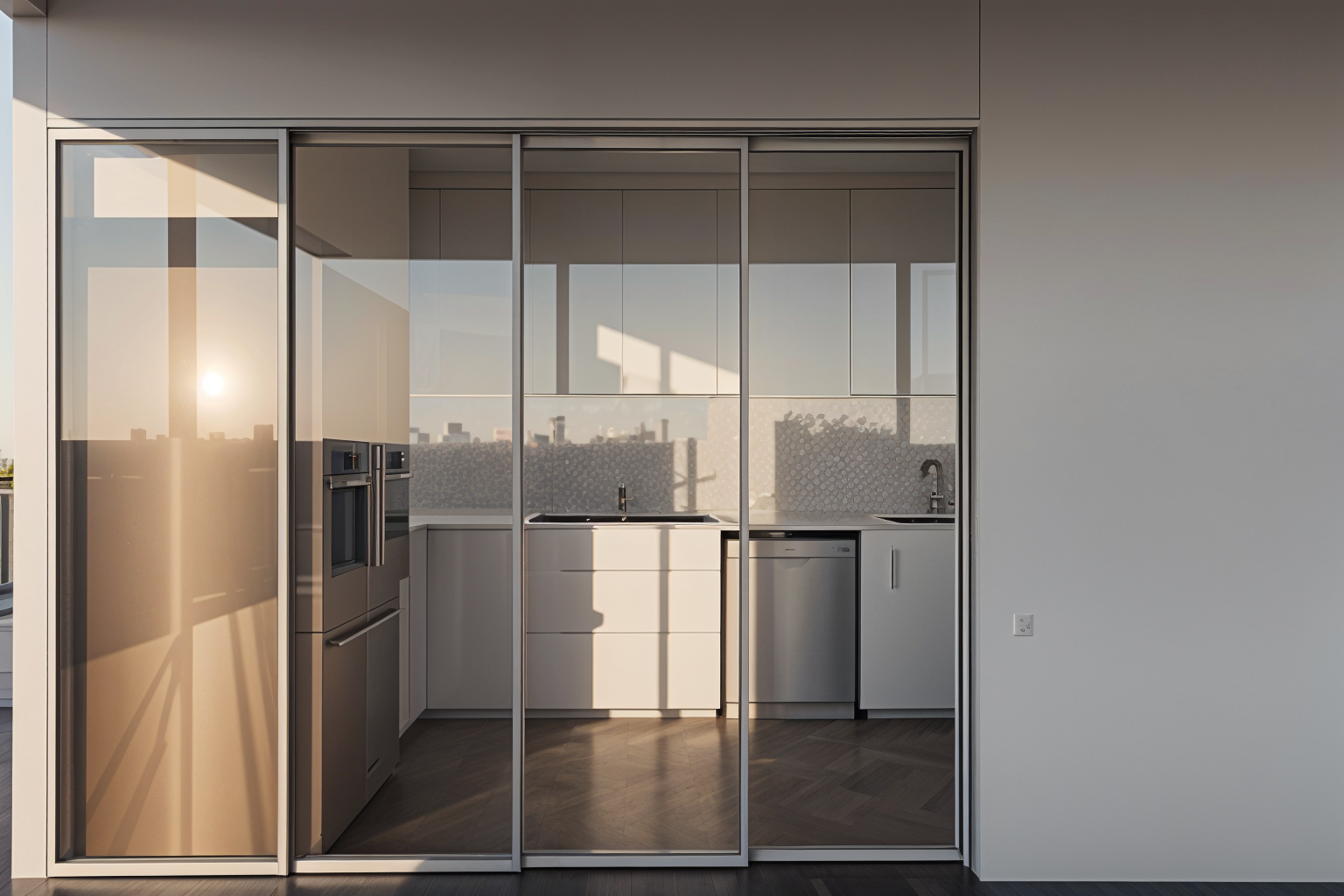 evening light outside the windows add light from the chandelier over the dining table add light from the recessed lights add some accessories and books on the shelves at the left side of the view add a woman standing at the sink in the kitchen add a man sitting on a middle stool at the counter add some appetizers wine glasses and a bottle of red wine on the counter make the light level in the kitchen a little lower and warmer in color add a floral arrangement on the dining table show the white calcutta same material on the wall of the kitchen as the counter add light from the chandelier over the dining table add light from the recessed lights add some accessories and books on the shelves at the left side of the view add a woman standing at the sink in the kitchen add a man sitting on a middle stool at the counter add some appetizers wine glasses and a bottle of red wine on the counter make the light level in the kitchen a little lower and warmer in color add some tea candles on the dining room table show the white calcutta same material on the wall of the kitchen as the countertops the louvered shutters in the kitchen window are painted white the louvered shutters in the kitchen window are painted white the walls and ceilings are painted white the upper cabinets in the kitchen have slab doors in white no pulls remove the floral arrangement on the dining room table add 3 sofa pillows on the bench at the dining room table make the glass blocks more translucent