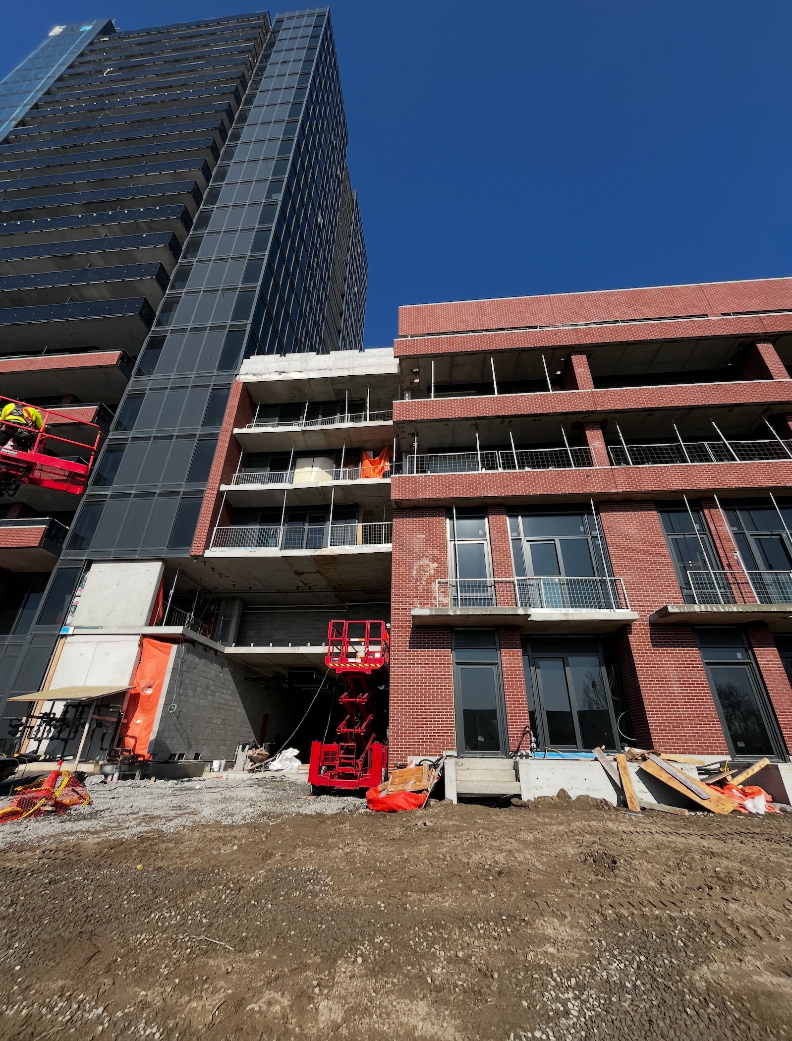 create a stunning urban construction scene featuring a modern building with a sleek dark glass facade and red brick walls emphasize the deep blue sky for a clear sunny day atmosphere highlight the red construction equipment prominently in the foreground capture the contrast between the rugged earthy texture of the construction site ground and the polished surfaces of the building use bright orange safety barriers and equipment to add vivid pops of color aim for a dynamic and vibrant cityscape filled with energy and progress