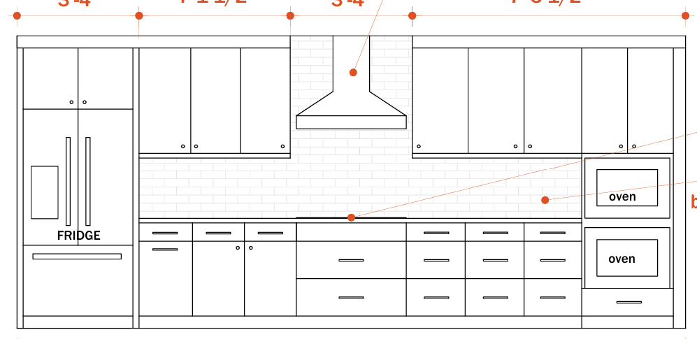 interior of a transitional kitchen kitchen sink and faucet is in the center of the elevation stainless steel hood at center of wall walnut stained cabinetry beautiful modern subway tile backsplash