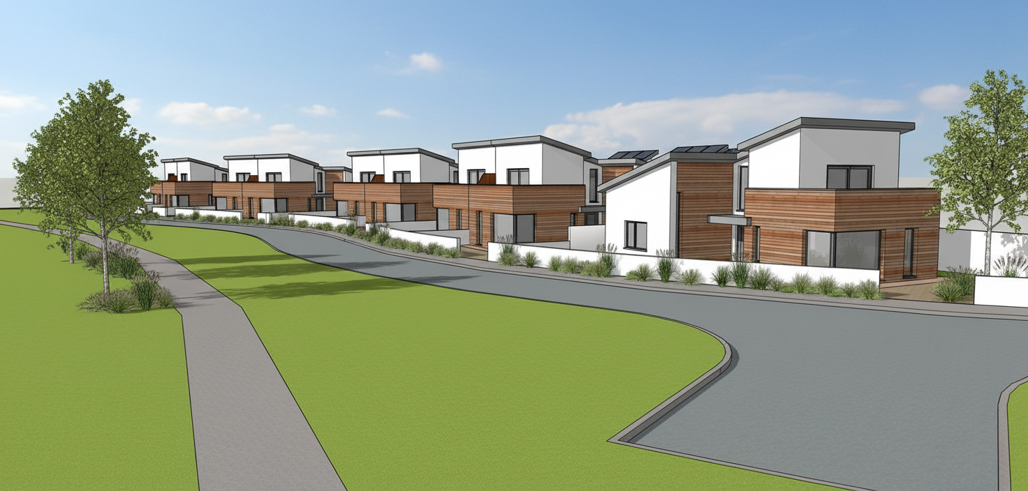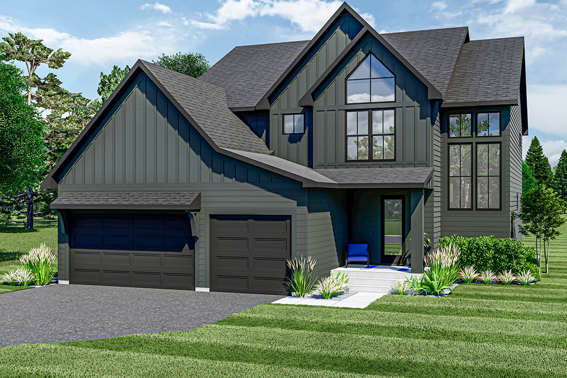 modernist exterior shot visualize a modern residential building with a contemporary design the building should have dark exterior walls large windows with reflective glass and sleek black accents along the edges the atmosphere should be light and airy with clear blue skies and soft sunlight casting soft shadows the surrounding landscape should include lush green grass colorful flowering shrubs and heavy tall deciduous trees with autumn colored leaves architecture shadows should be to the back of the project with sunlight to the front at dusk