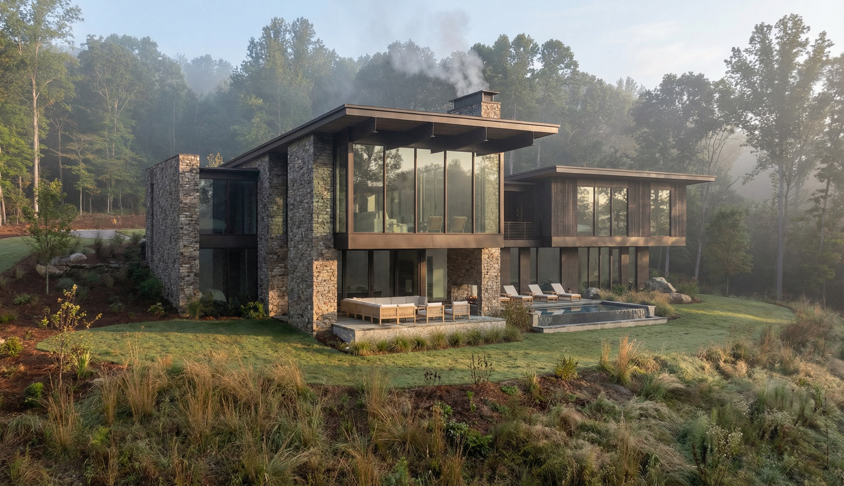 render this japandi kitchen do not change the design dimension and materials in the model bring natural light through windows add the cabinet light to the sit on counter glass cabinet add linear led lights under the floating shelves countertop is dark green soapstone insert hood is off white micro cement the backsplash is porcelain slab with off white concrete look without any particles the wood cabinets are solid wood medium walnut kitchen floor is 24 x 24 porcelain tile in off white concrete look without any particles