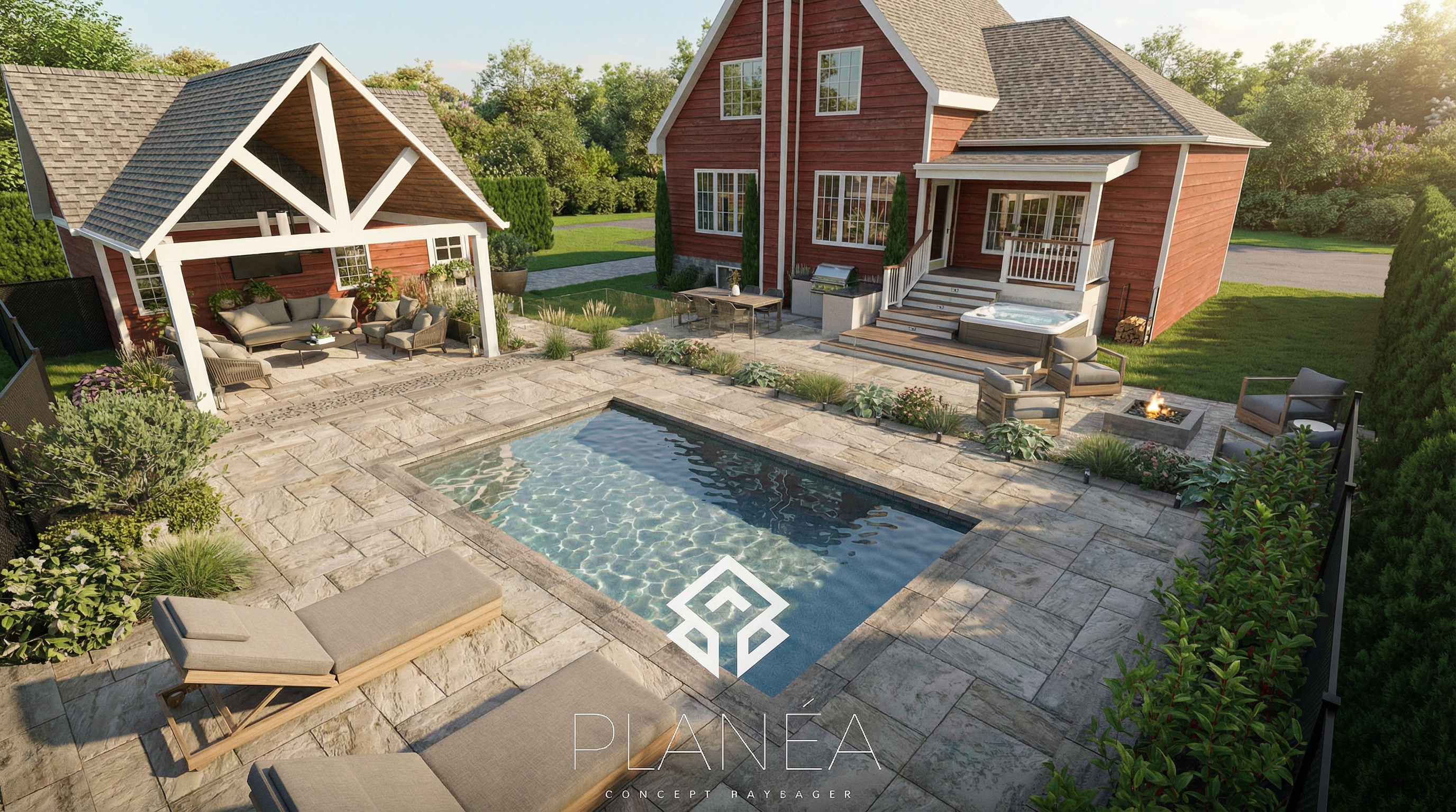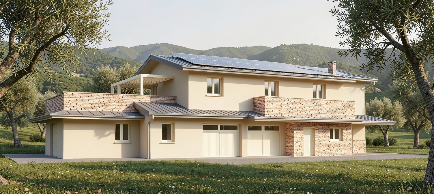 fai uno scenario notturno aggiungendo dei corpi illuminanti nel giardino con creazione di luci a spo difusse in un gioco di luce e ombra ed evidenziando le facciate della casa con strip led e qualche faretto