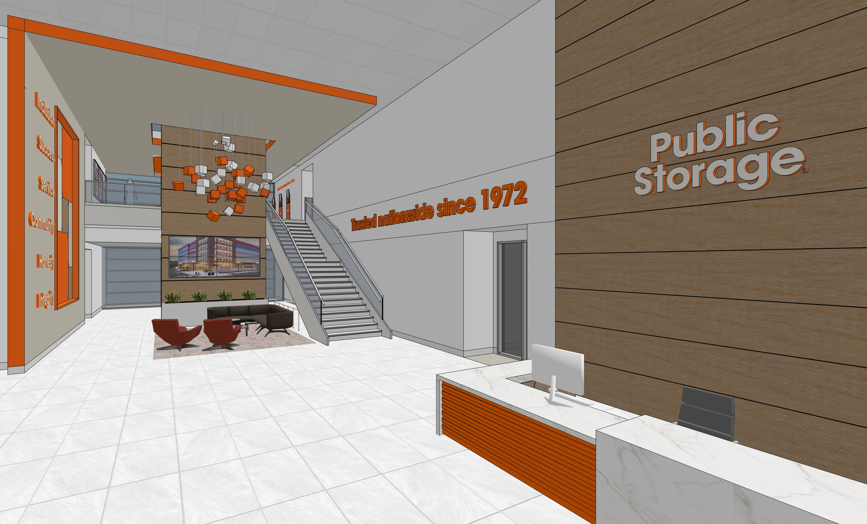 photorealistic interior polished tile floors white walls and light metal orange accents boxes floating in the ceiling in the middle are soft light glowing there s wood accents on the middle tower the space is lit up with soft ceiling soft lights bright lighting and overall environment is soft bright lighting