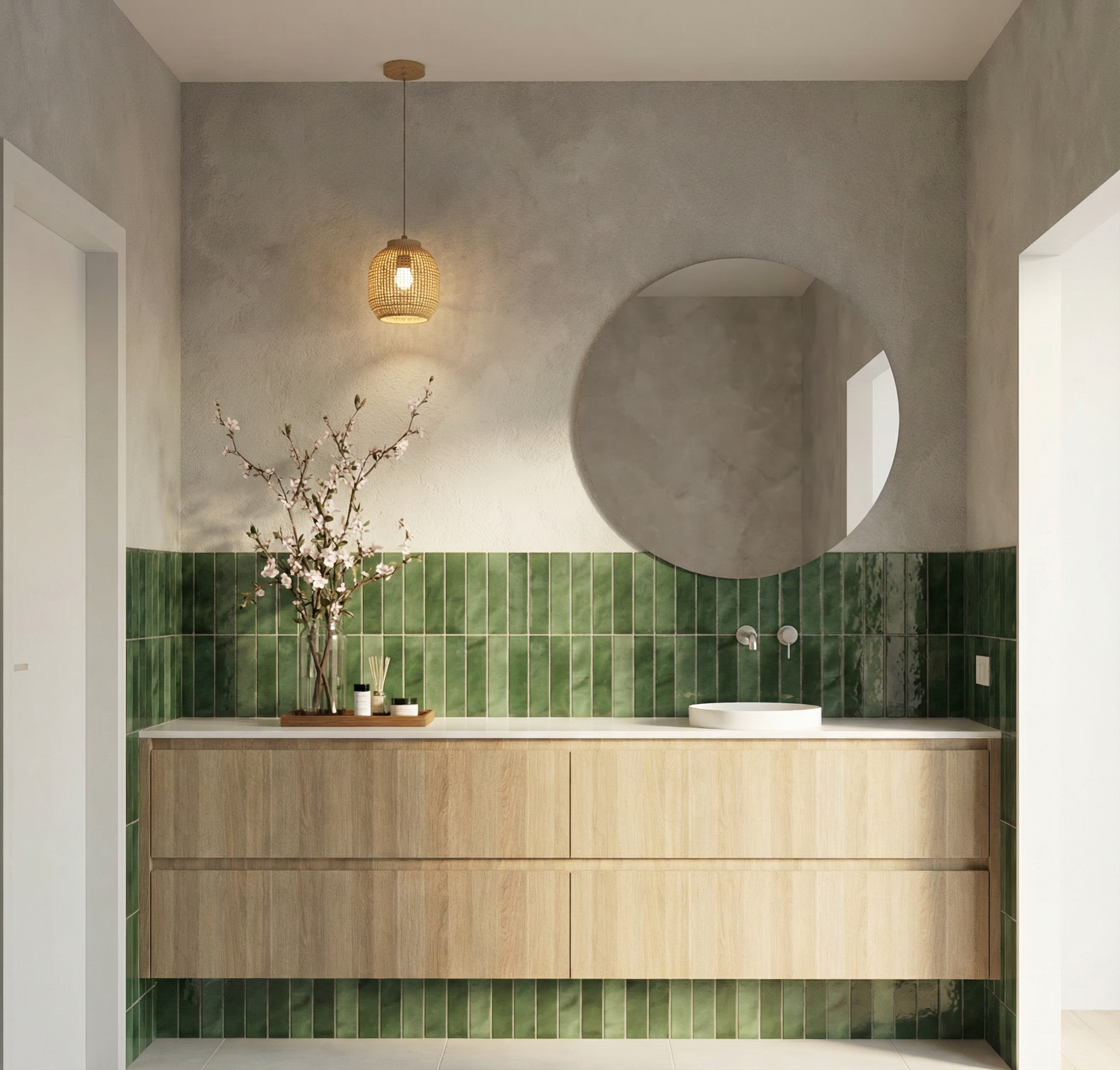 convert to high resolution render and make it realistic the cabinetry colour is polytec maison oak matt finish the light is this one in green https hugbel com products nordic colorful glass pendant light variant 49164451807564