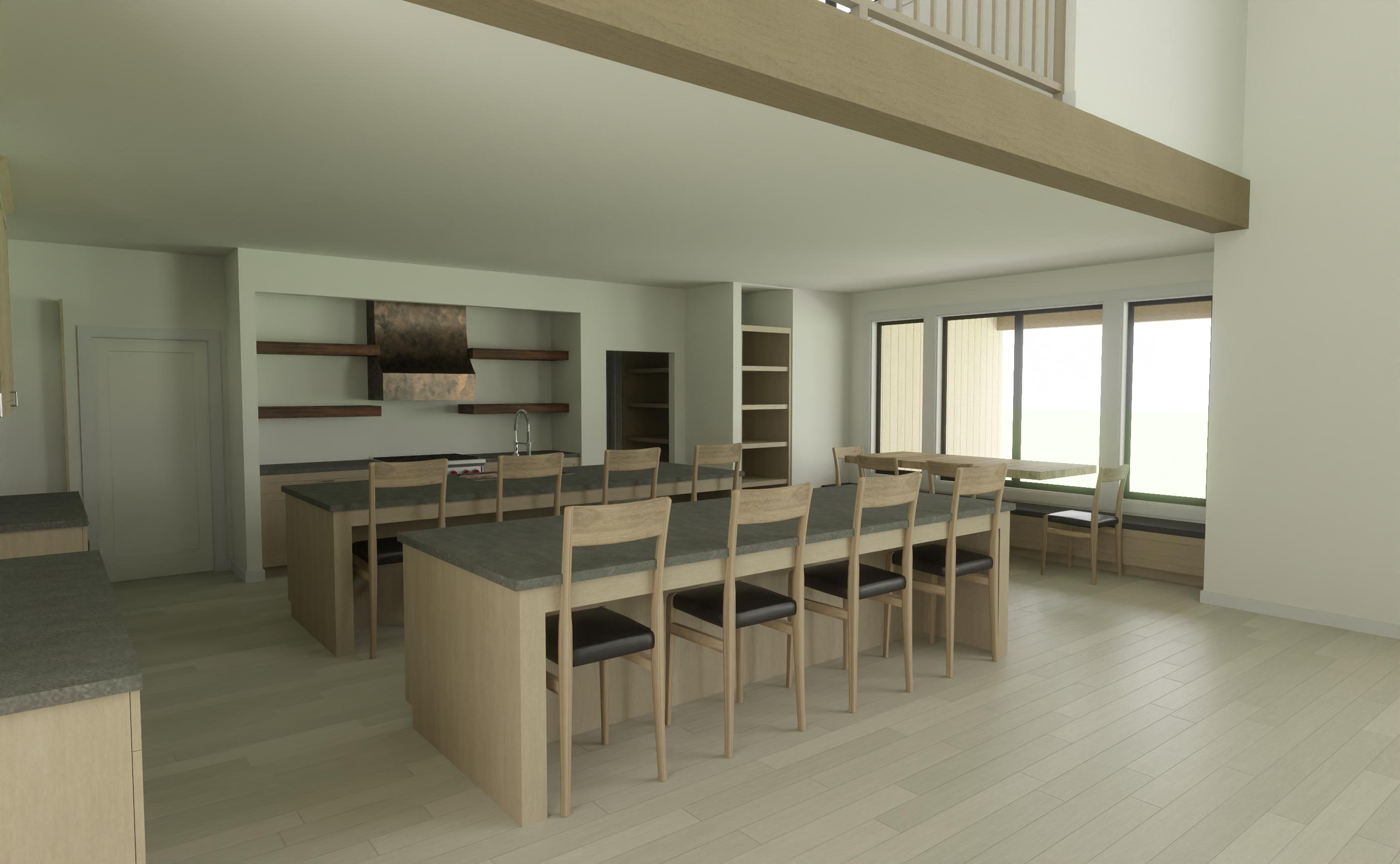 it s important to keep the sizes of everything the same change textures and materials but keep the sizes of everything the same make rock realistic its important to keep to scale this room is big do not change size of windows or doors do not add doors or windows do not change or add fixtures warm modern luxury kitchen large waterfall island with light gray marble or quartzite subtle veining polished finish thick countertop profile full height slab waterfall edges light natural wood cabinetry mixed with painted off white cabinets flat panel doors minimal hardware integrated appliances soft warm lighting oversized pendant lights with pleated fabric shades and brushed brass accents tall brass faucet neutral color palette creamy whites warm taupes light wood tones wide plank oak flooring clean and minimal styling high end residential design soft ambient glow architectural visualization ultra realistic 8k detail add tile back splash behind stove in same style