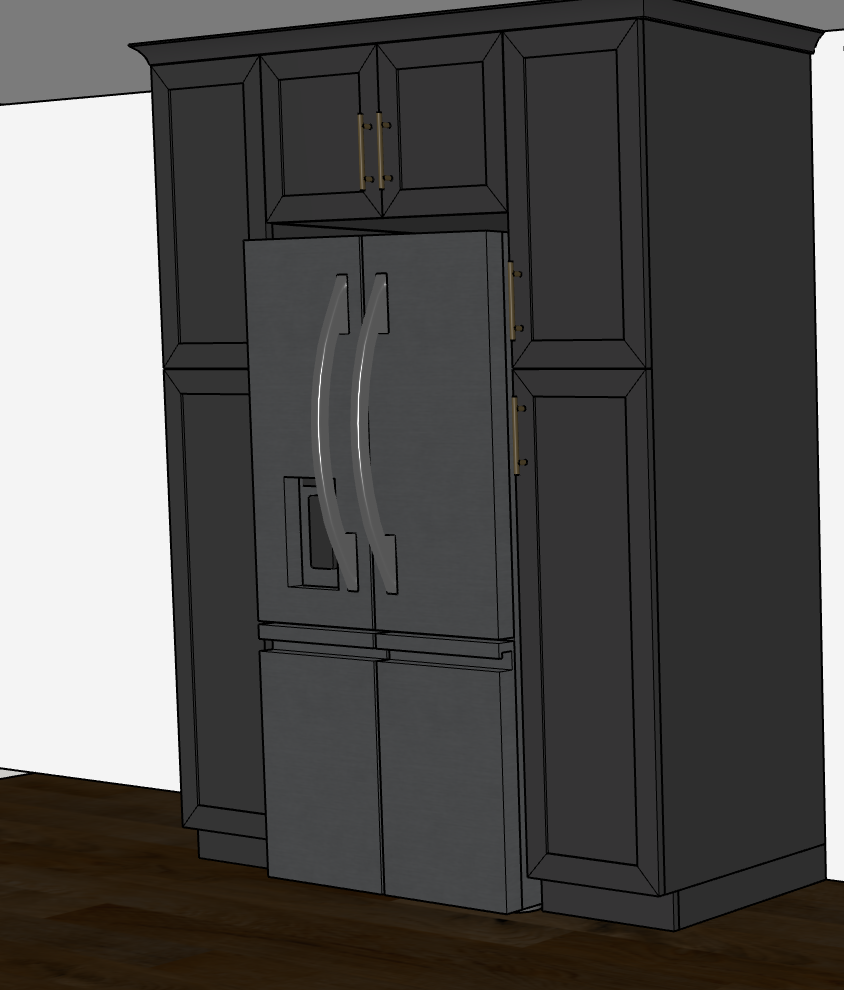 this is a wall in a beautiful kitchen with charcoal grey painted cabinets topped with a nice cove crown molding the handles are brushed brass and the floors are a beautiful darker hard wood lots of natural light is coming in from behind the camera