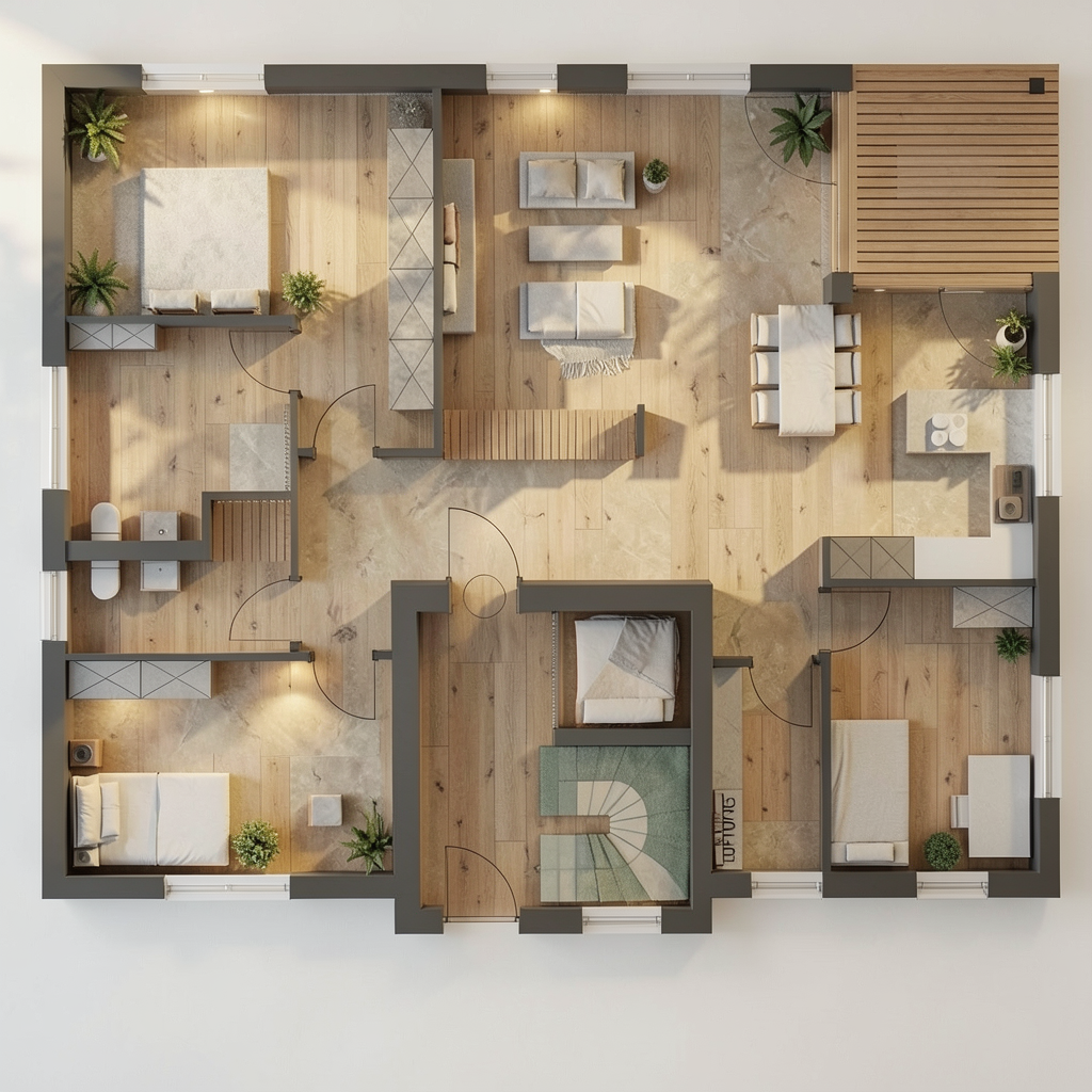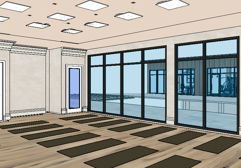 enhance this pilates studio render into a photorealistic interior while keeping the exact same layout camera angle proportions and object placement do not change or redesign anything preserve all architecture window positions ceiling panels and mat layout exactly as is improve materials and lighting only realistic wood floor texture soft fabric yoga mats natural daylight coming through glass doors subtle reflections accurate shadows warm neutral tones soft ambient ceiling lighting add realistic depth global illumination and high end interior finish clean modern luxury wellness studio aesthetic ultra realistic 8k sharp details