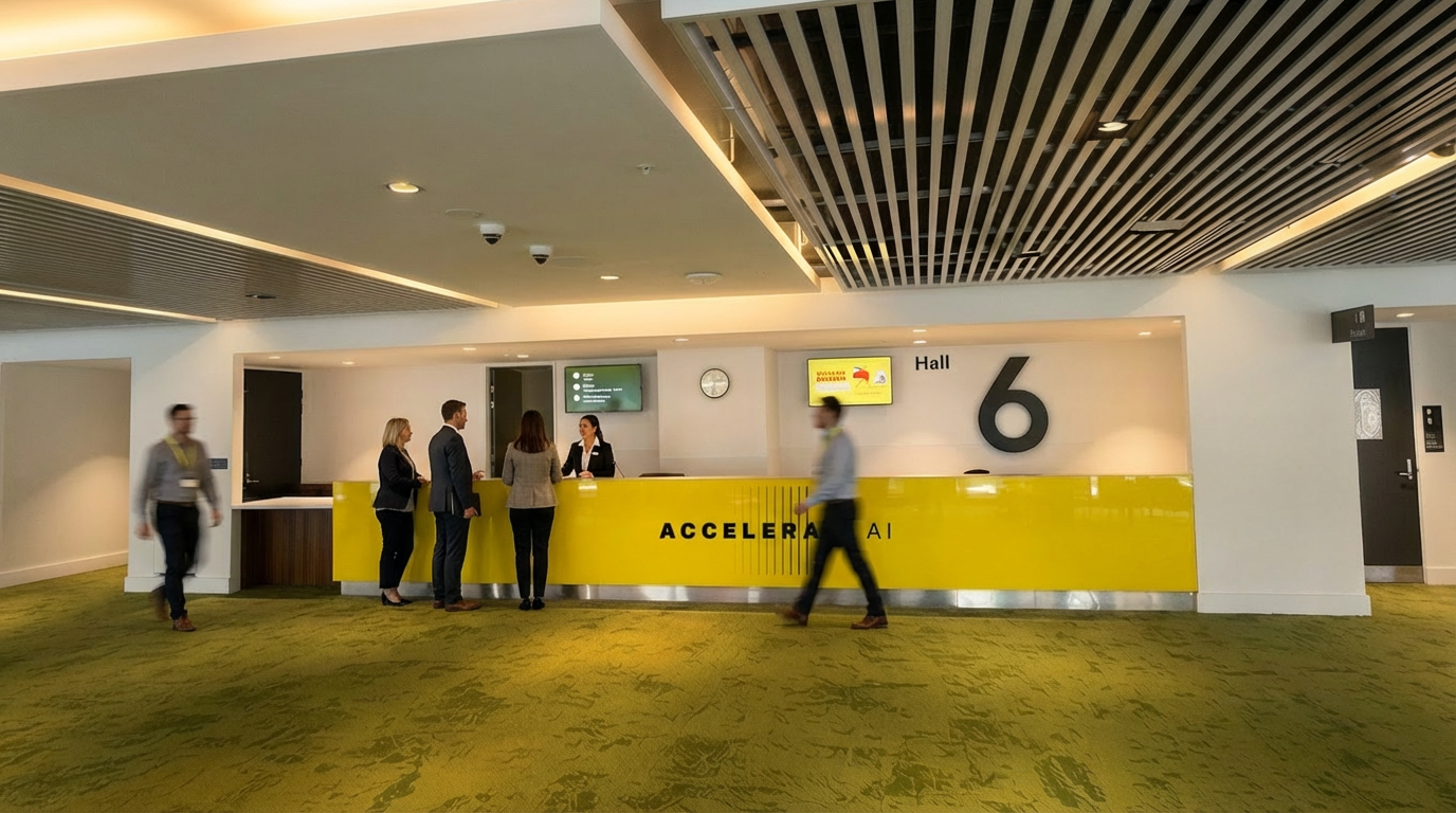 add receptionist behind counter serving a business man and woman on the left and under the right of the tv screen add 2 blur business people with lanyard walking past the receptionist