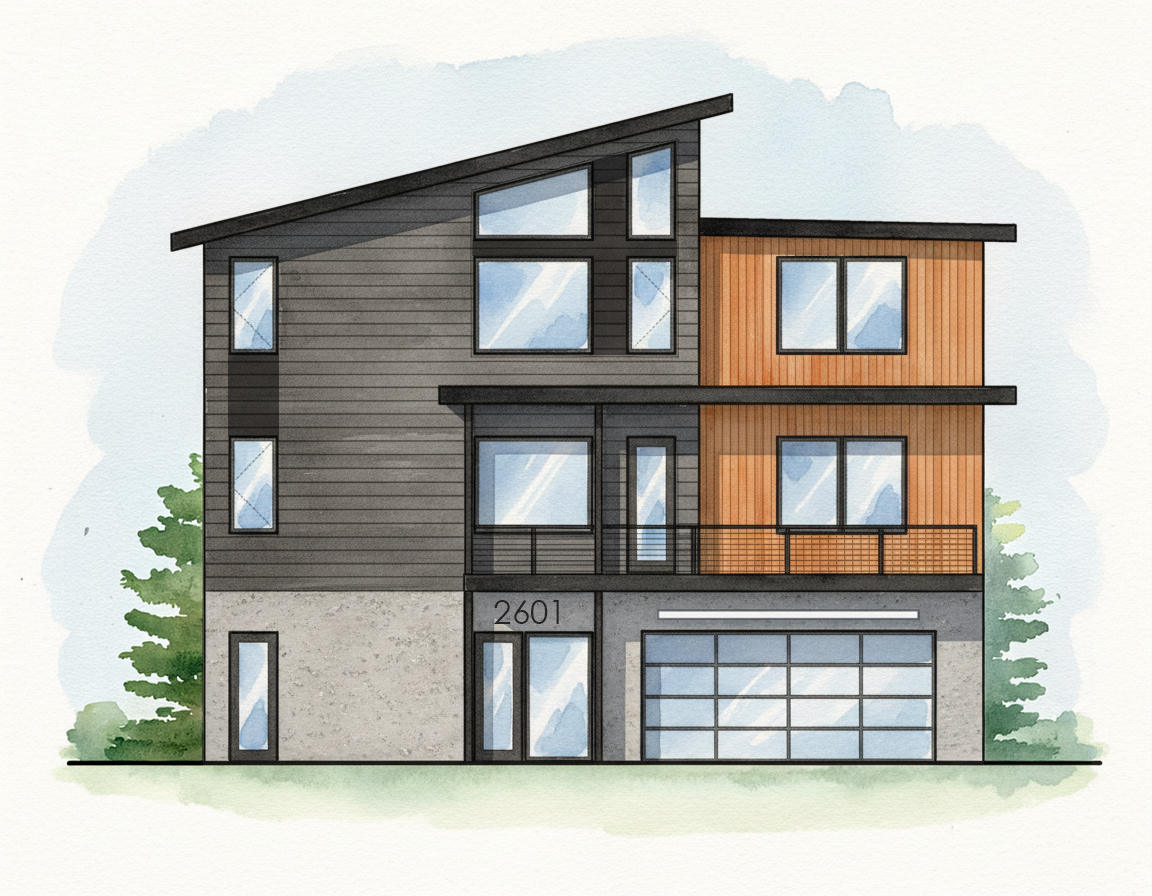 turn the attached watercolor sketch into a photoreal rendering of the house keep geometry massing window placement and details the same high fidelity and representation is important this should be a daylight rendering of the house