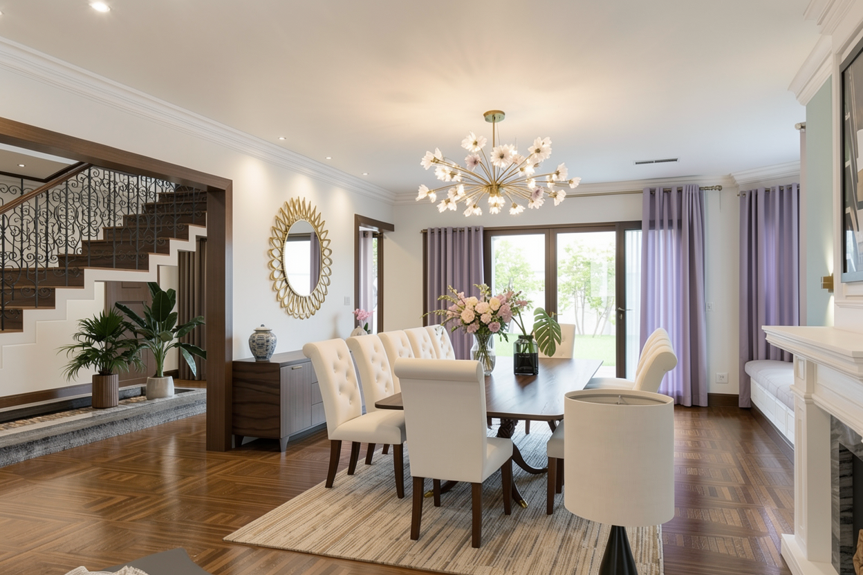 keep the exact original perspective camera angle proportions lighting and all architectural elements exactly as they are do not modify the staircase walls floor ceiling window frame shadows or overall composition remove the curtains completely replace only the glass surface of the window with a custom printed window film the window frame and surrounding elements must remain 100 unchanged the film should feature a high end stylish contemporary artwork that looks sophisticated and perfectly suitable for an interior design presentation the design should feel refined architectural and elegant not playful not decorative the film must appear realistically applied directly onto the glass surface slightly translucent allowing soft diffused daylight to pass through natural light interaction must remain realistic and consistent with the original image the result should look like a premium interior design concept visualization ultra realistic no camera movement no new objects no changes outside the glass area