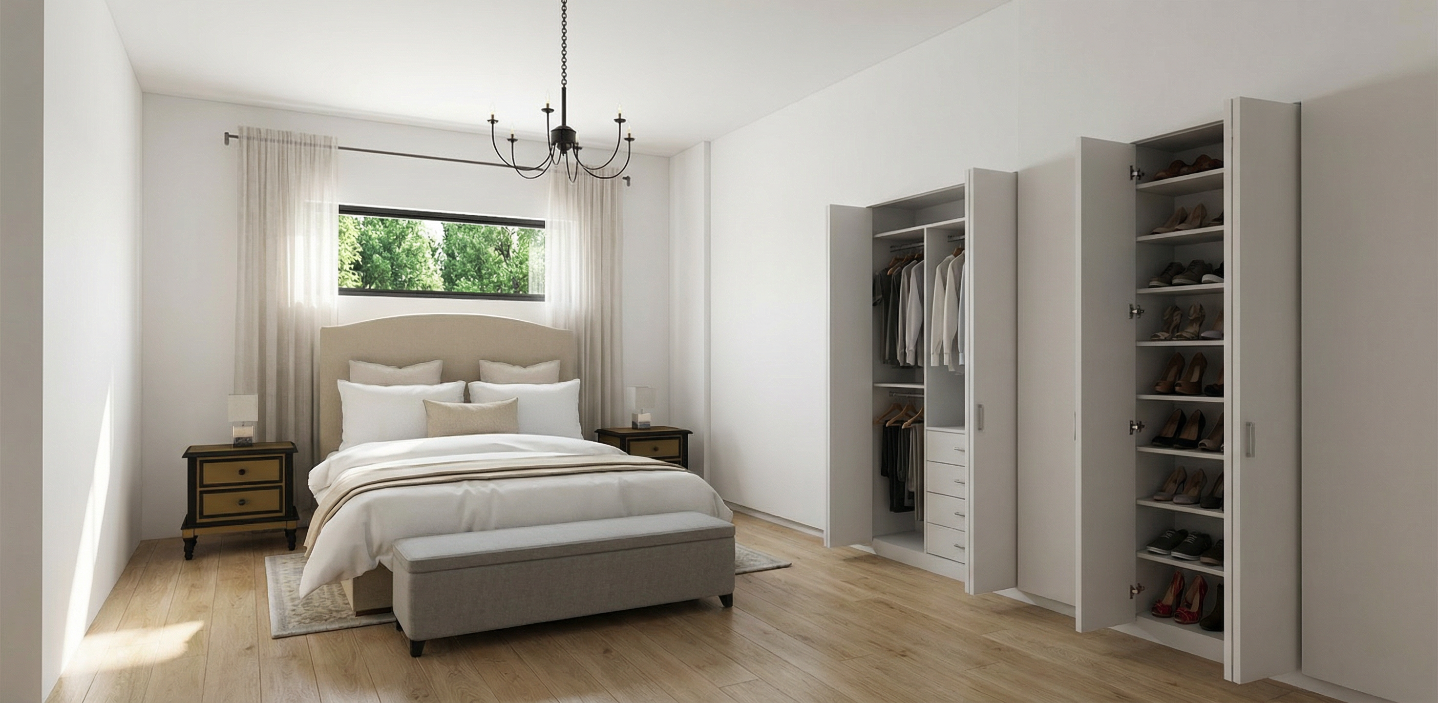 use the unfinished image as the base and strictly preserve the exact camera angle perspective and layout do not move walls openings or viewpoint install the kitchen only along the right wall of the image the long wall with exposed studs place all base cabinets and countertops flush against this wall following its full length and perspective do not place cabinets on the left wall or back opening keep the center and left side of the room open as a walkway apply the reference image style cream cabinets white countertops warm lighting without changing layout all elements must align to the wall plane and perspective lines of the base image