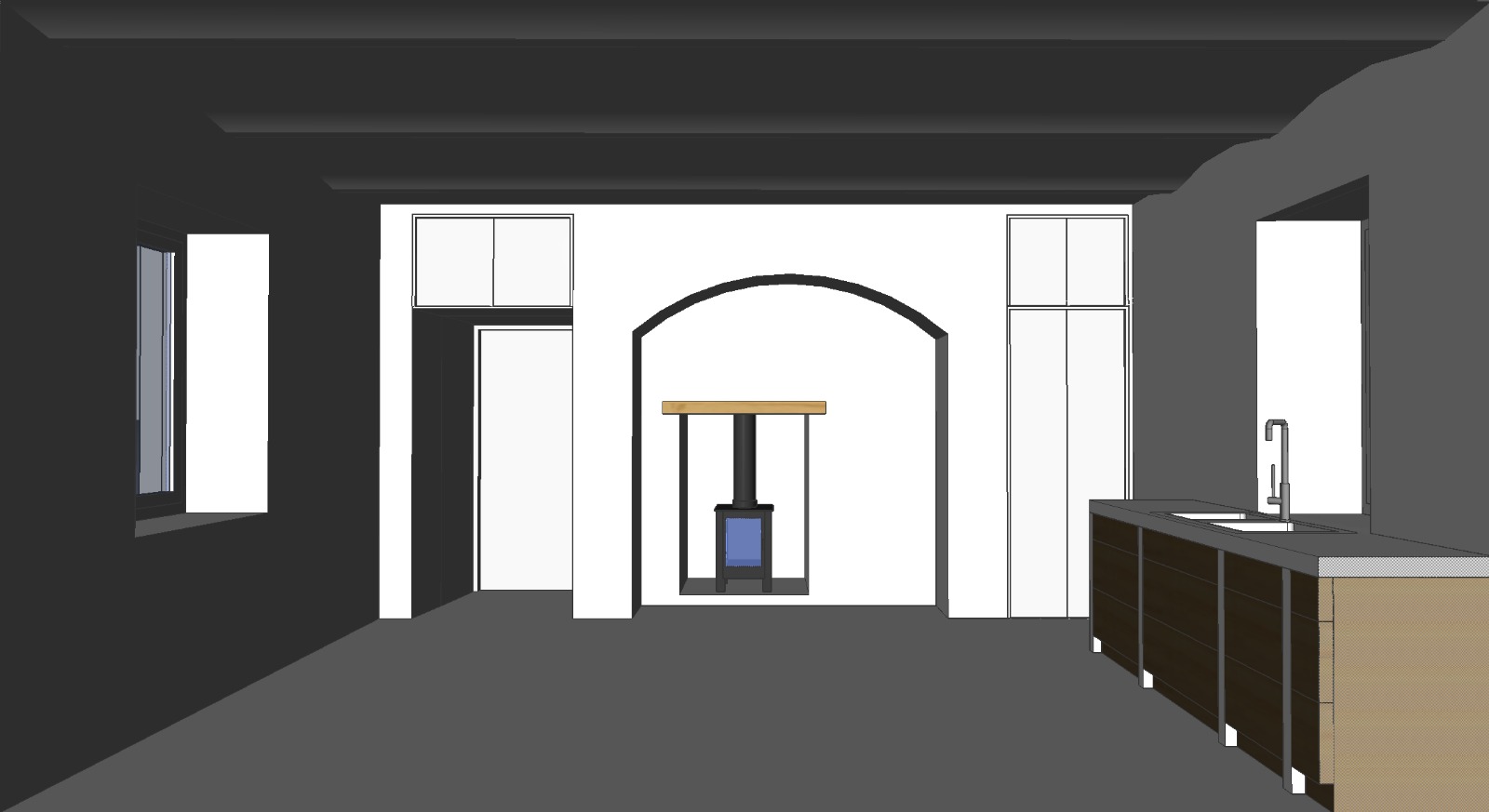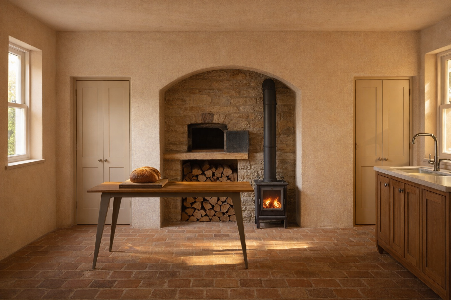 interior shot the ceiling has subtle arches the walls are a warm sand colour lime plaster the lintel above the fireplace and the kitchen cabinets are both in chestnut wood the tap is brass the sink porcelain the inner back wall of the arch is pietra di langa natural stone