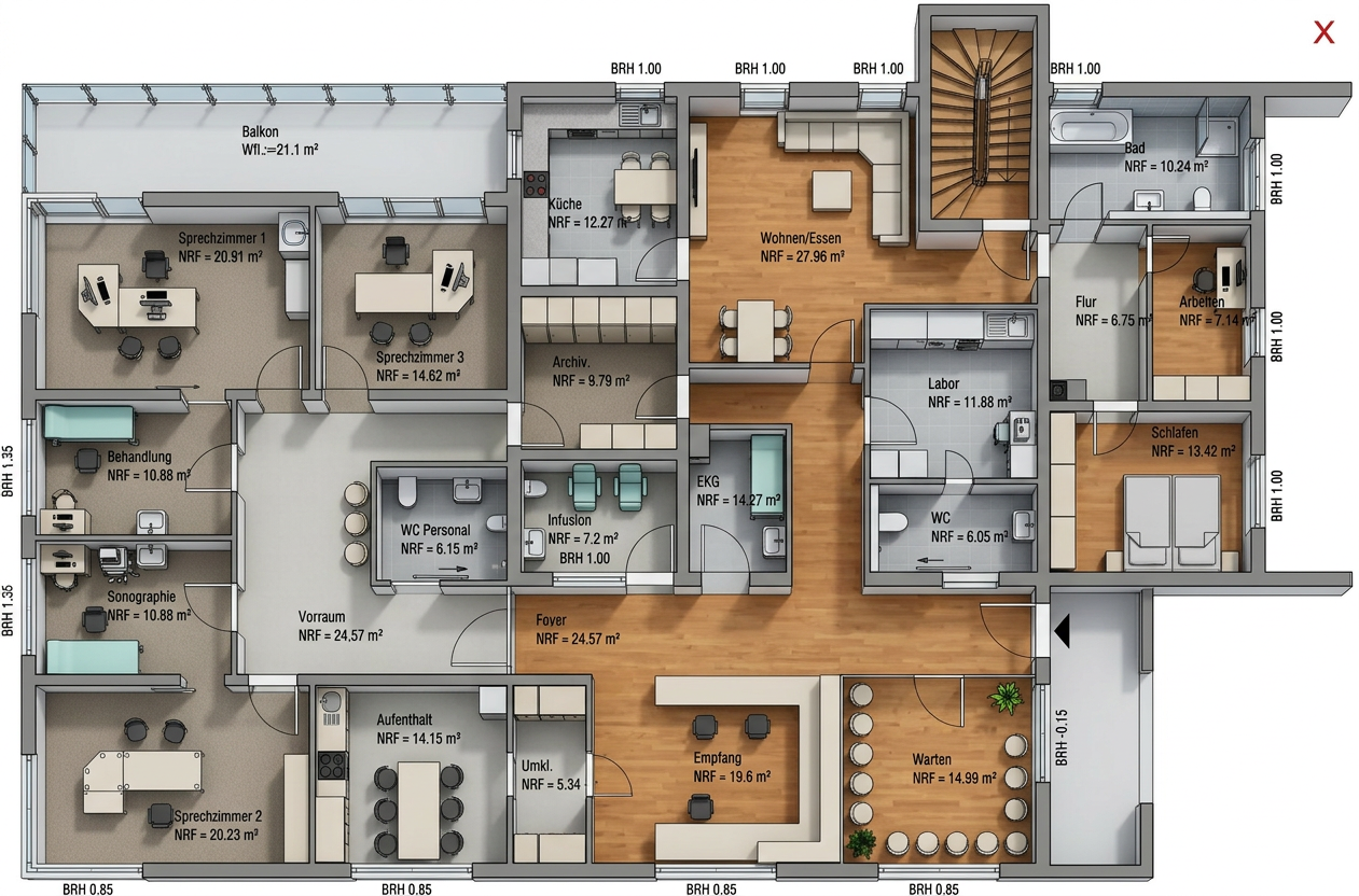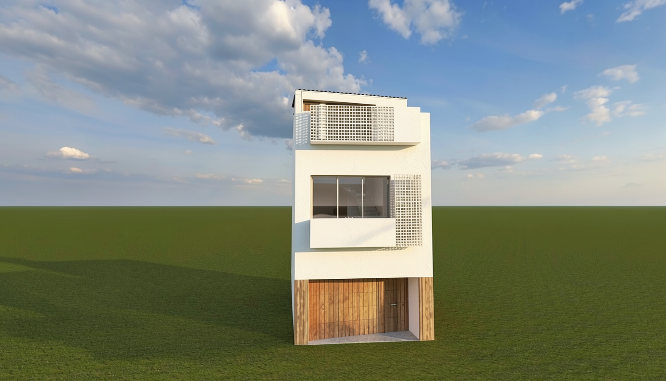 preserve the existing materials and composition keep the window frames and the fence of the middle building a light beige color keep the scene natural and ensure a serene calm atmosphere and make sure the building has a light small brick facade