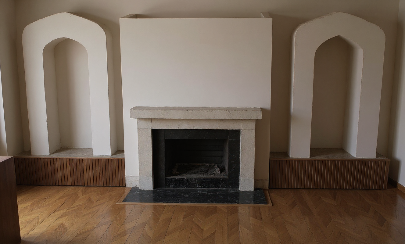 mediterranean style massive oval olive table 4 light color chairs big art picture on the wall blue or light wooden furniture
