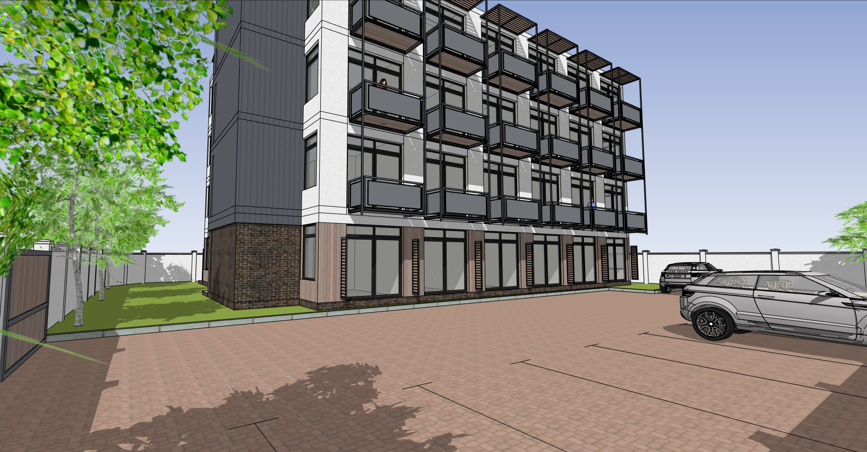 exterior shot a modern apartment building in a suburb of cape town with a warm sunny day render some clouds in the sky and a few seagulls flying overhead architecture