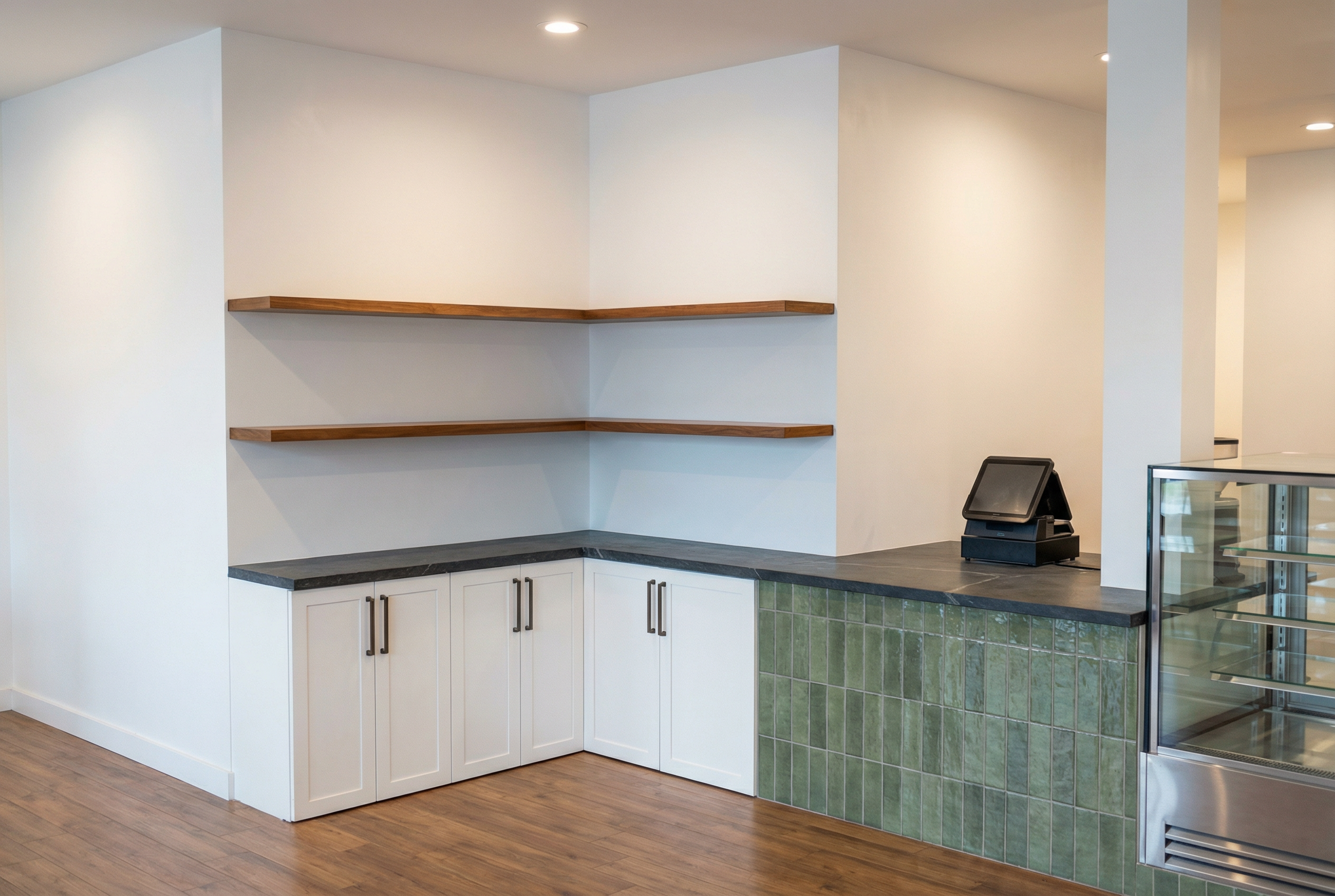 warm white kitchen with a light white range hood marble countertops on a sunny day