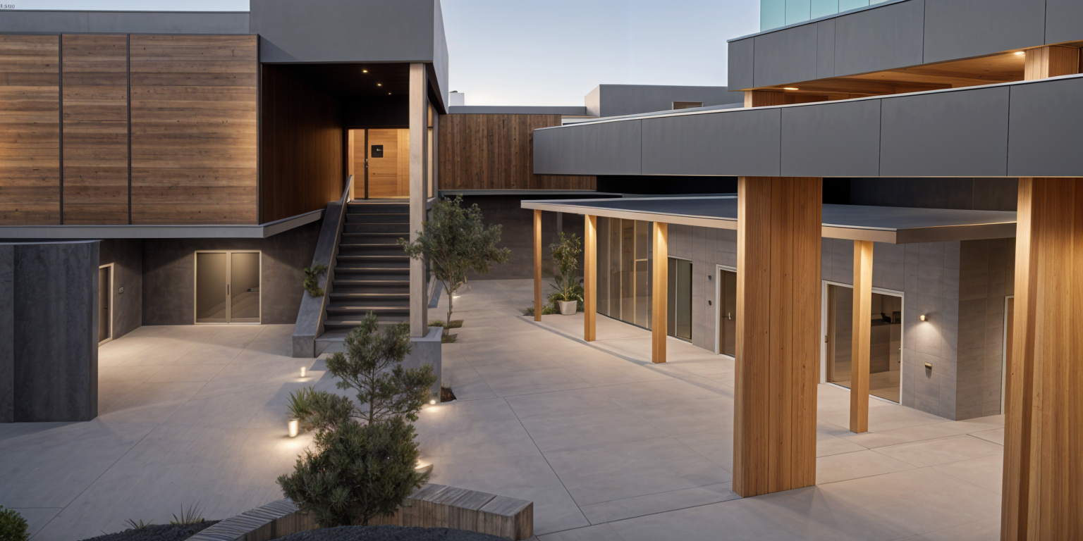 bobby mcalpine rooftop shot make this a sport center make the concept simple woody yet aesthetic with nature make it look like a sport public space with people make it look like evening and dont use all wood combine with grey make the room filled with people working out architecture