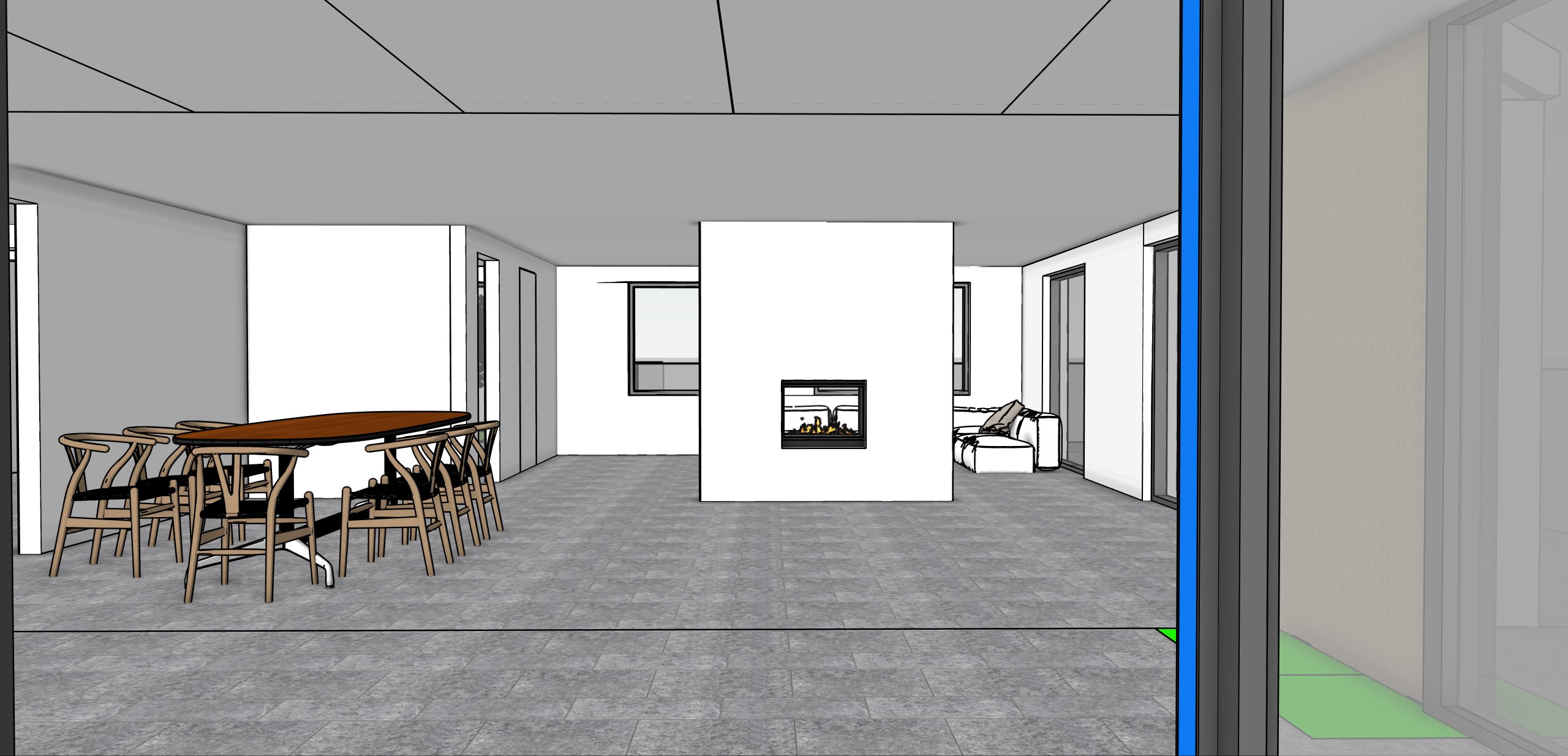 this is a beachside modern bungalow with jura limestone floors white walls with contemporary art and eams office table on the left hand side with wenger chairs there is a see through fireplace built into a freestanding wall in the centre with chairs around it and in front of it in the background is a living room with a tv on the wall on the left hand side and comfortable low level brown leather couches