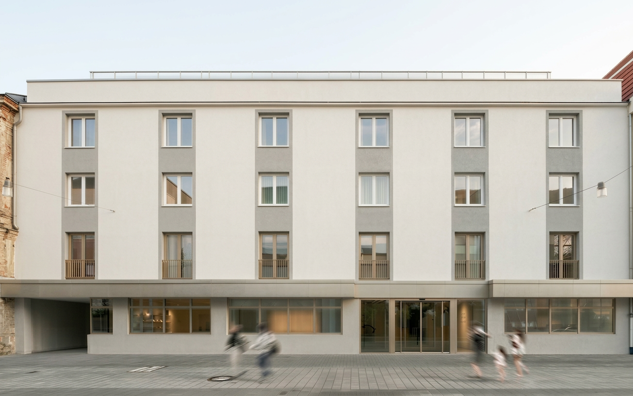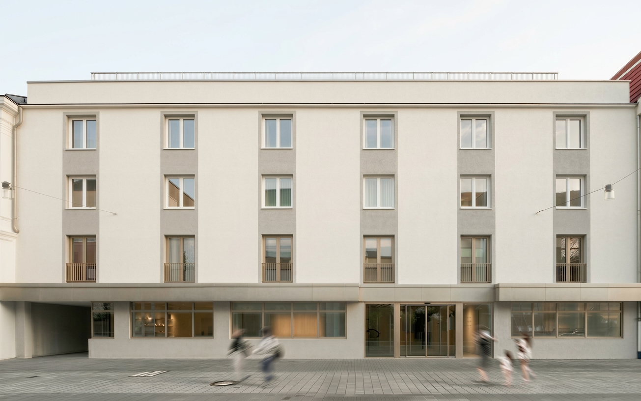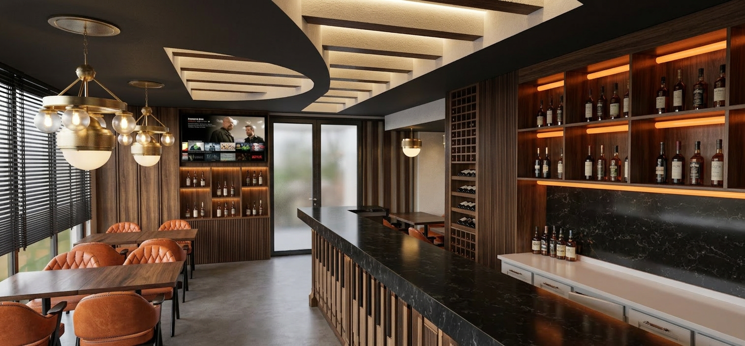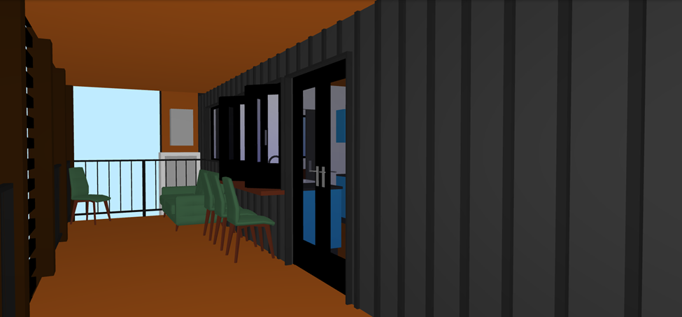 this the outdoor deck area on the first floor of a small modern home there is a 4 piece bi fold window between the kitchen and the deck with a small bar and high top tables in the background there is a mini split condenser along with an exterior tankless hot water heater on the wall the exterior of the home is in black board and batten vertical siding and the deck boards and ceiling boards are a dark colored walnut beyond the deck should be spruce and pine trees with golden hour lighting