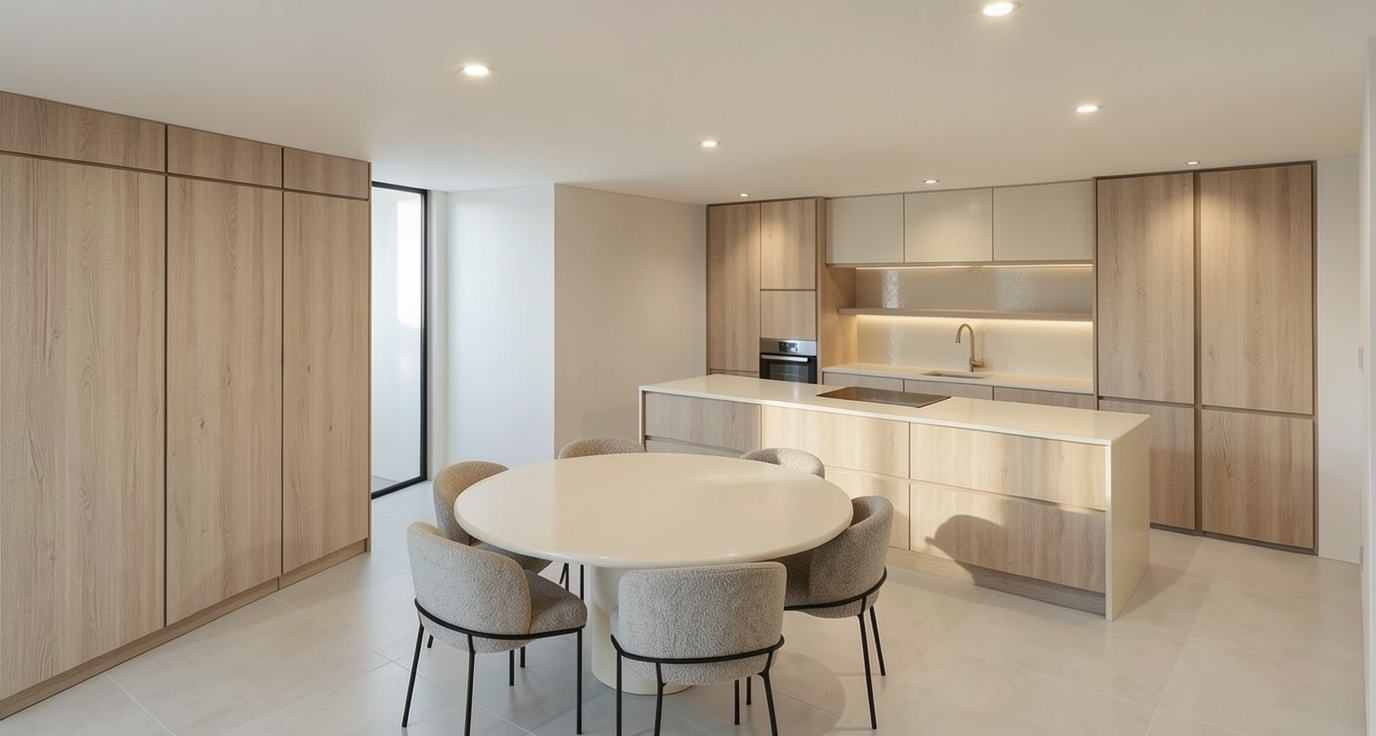 white kitchen with medium stain ilsand stainless refrigerator