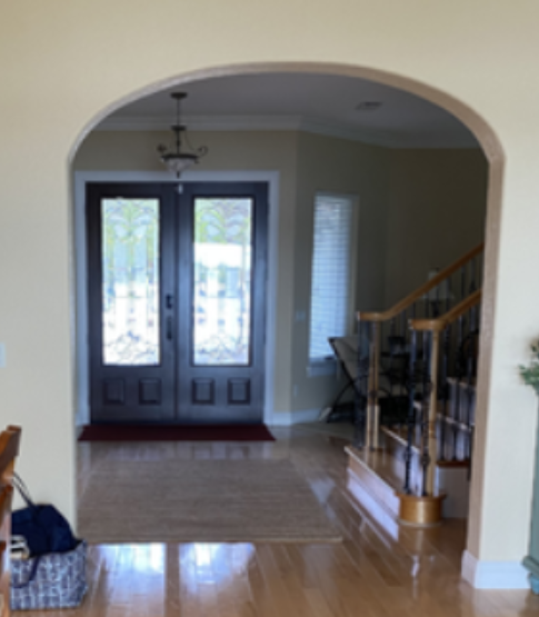 please add a new 4 light double door in a lighter stain than shown please update the stair railings add board and batten molding halfway up walls