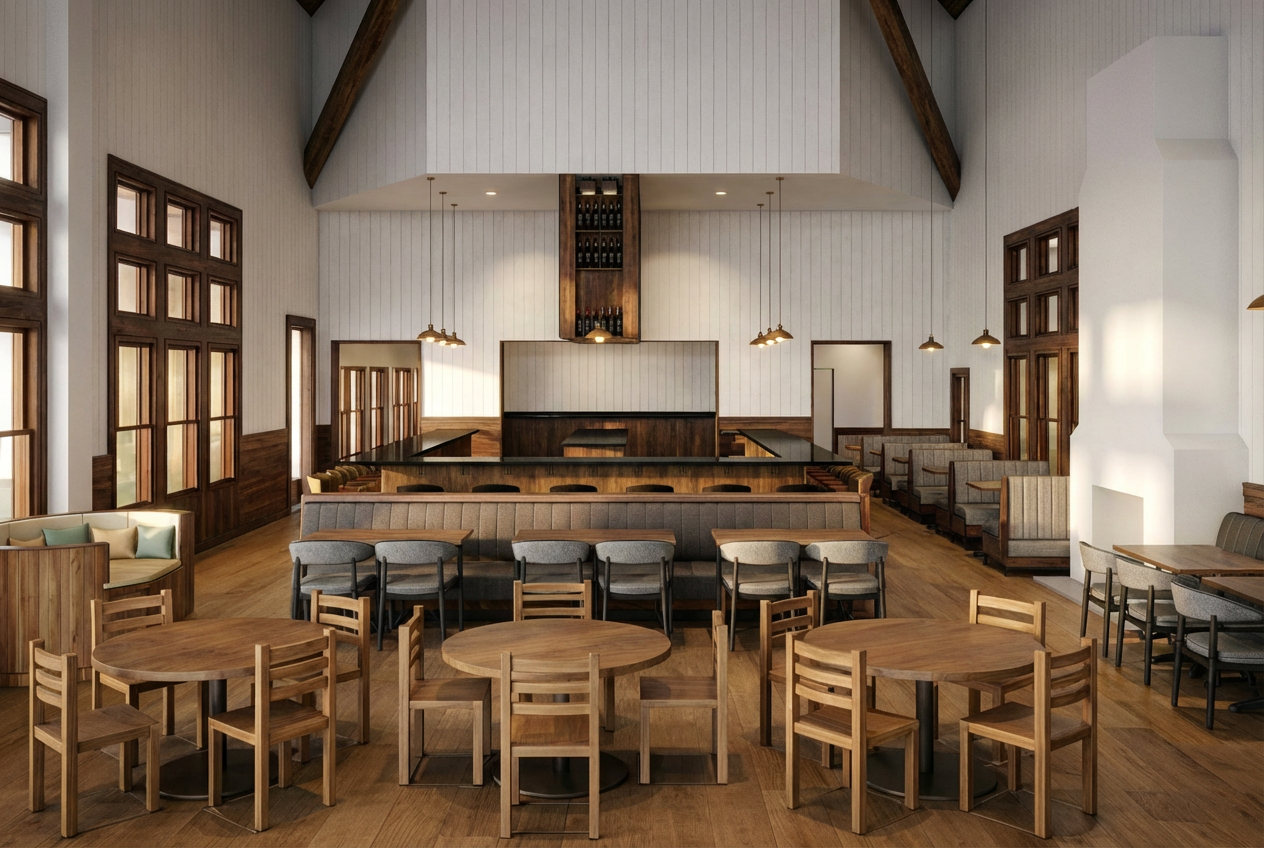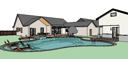linen white lapsiding with ashlar stone base add landscaping and string lights under black pergola
