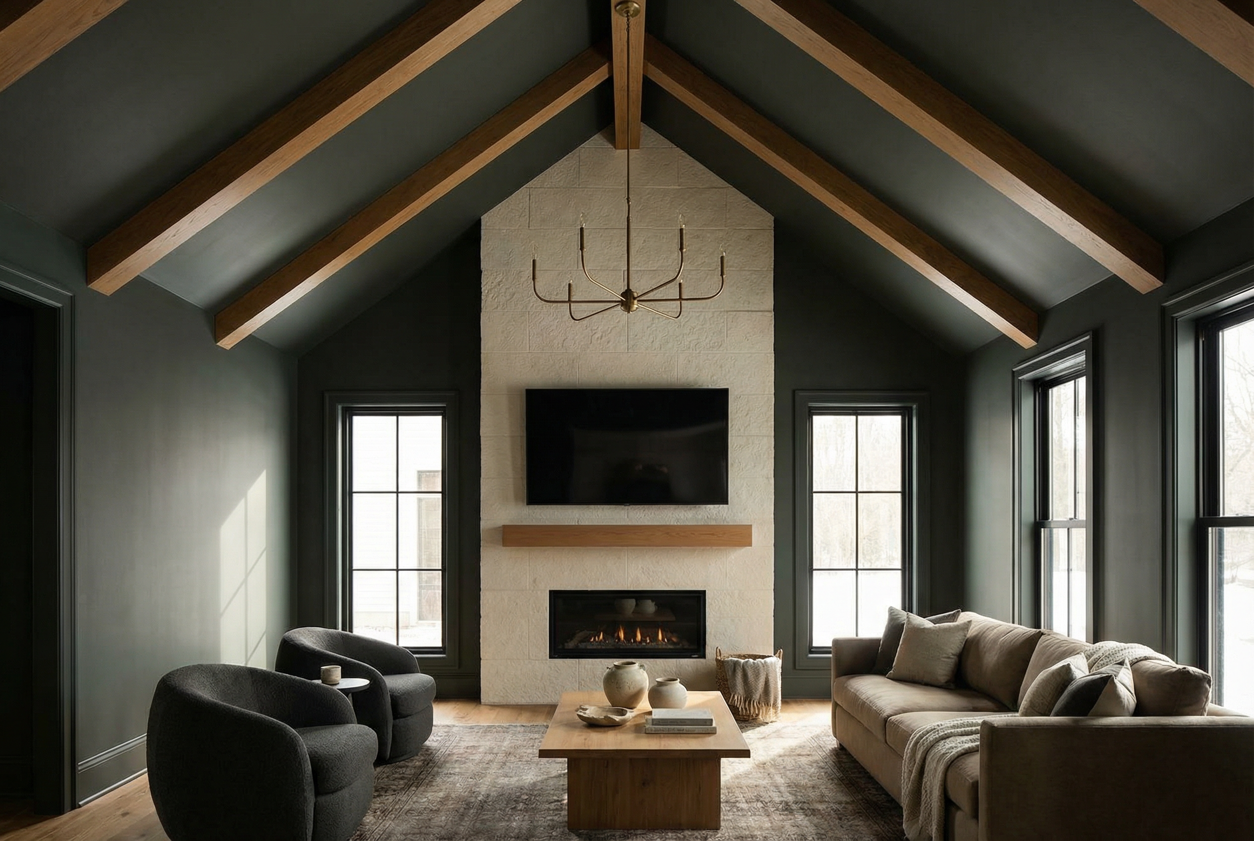 blue grey siding with white trim windows to have black mullions show doors as natural white oak slate grey roof