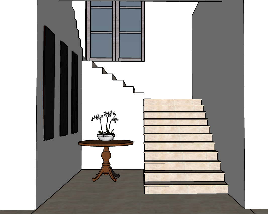render this space the material of the stairs is ivory french stone no pattern just the stone like travertine same as the floor the walls are smoth white and the window frame is also white and the glass looks at a forest add rails on the stairs and add wall art in the black panels that is traditional and goes with the space make it so it has a brass frame and in the middle of each panel is just light pink the art should not excied the size in the picture generate a handrail going all the way up the stairs except fot the window and add rail posts in the exterior edge of the stairs going up