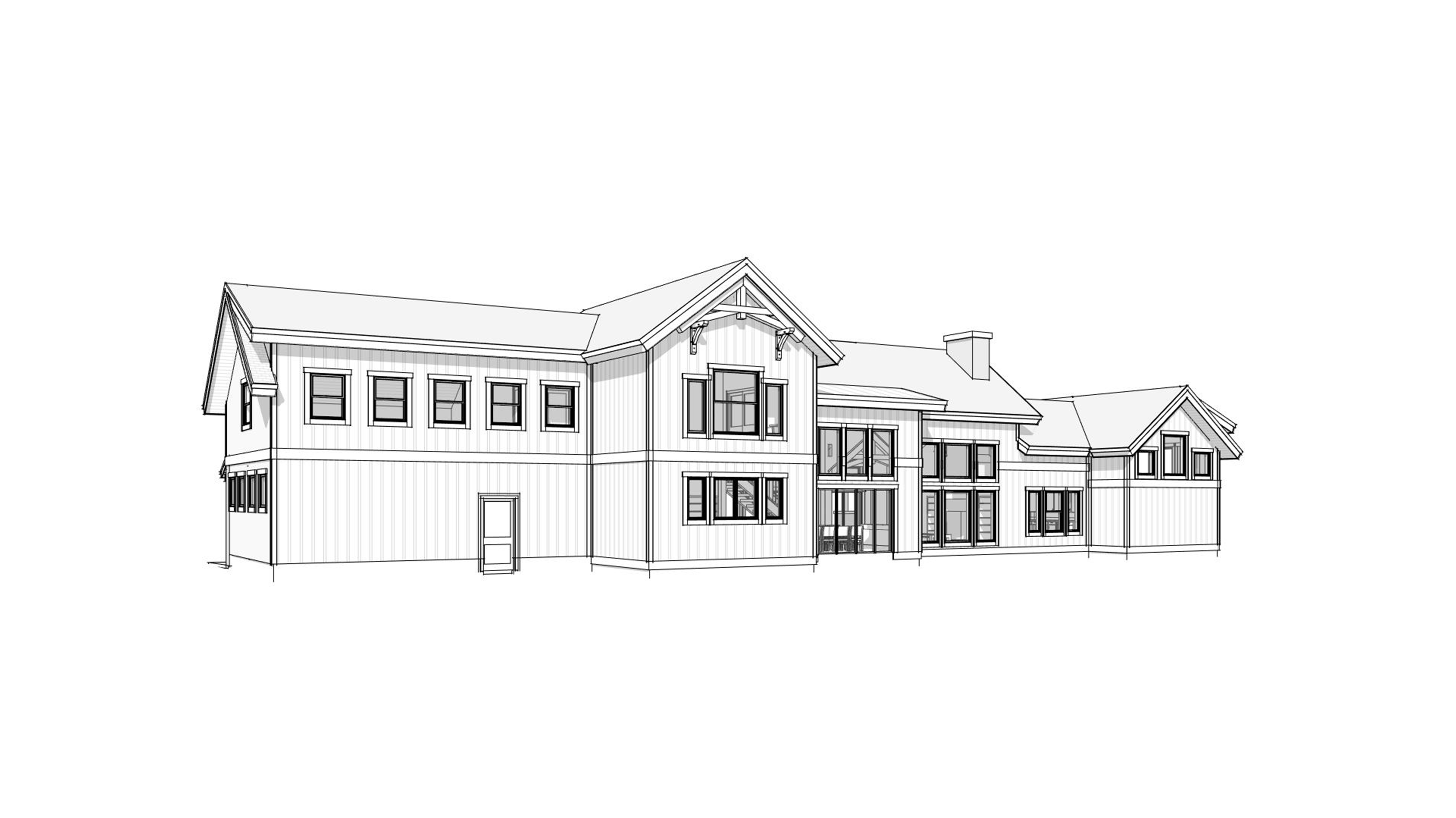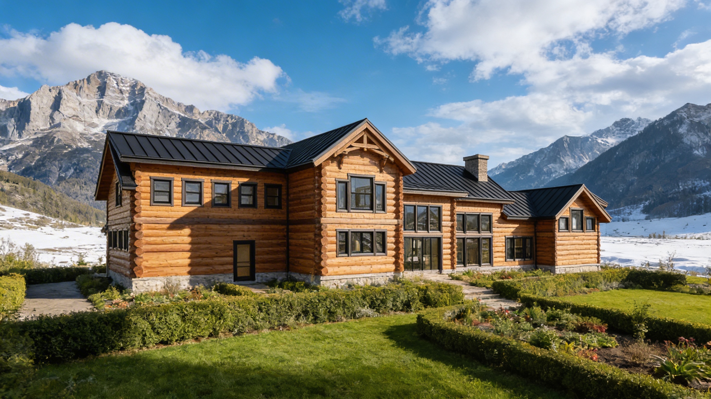 clean mountain modern timber architectural exterior rendered in cinematic vibrant mid day lighting with vibrant blue skies and fluffy white clouds mountain modern with heavy timber architectural style select grade horizontal cedar siding beautifully lush green manicured landscape around structure with hedges and gardens black standing seam metal roof prominent cinematic mountains and snowy grounds in the background high fidelity photorealistic visualization crisp shadow falloff refined facade geometry soft atmospheric depth premium architectural photography mood ultra clean composition and materials dark trim around windows