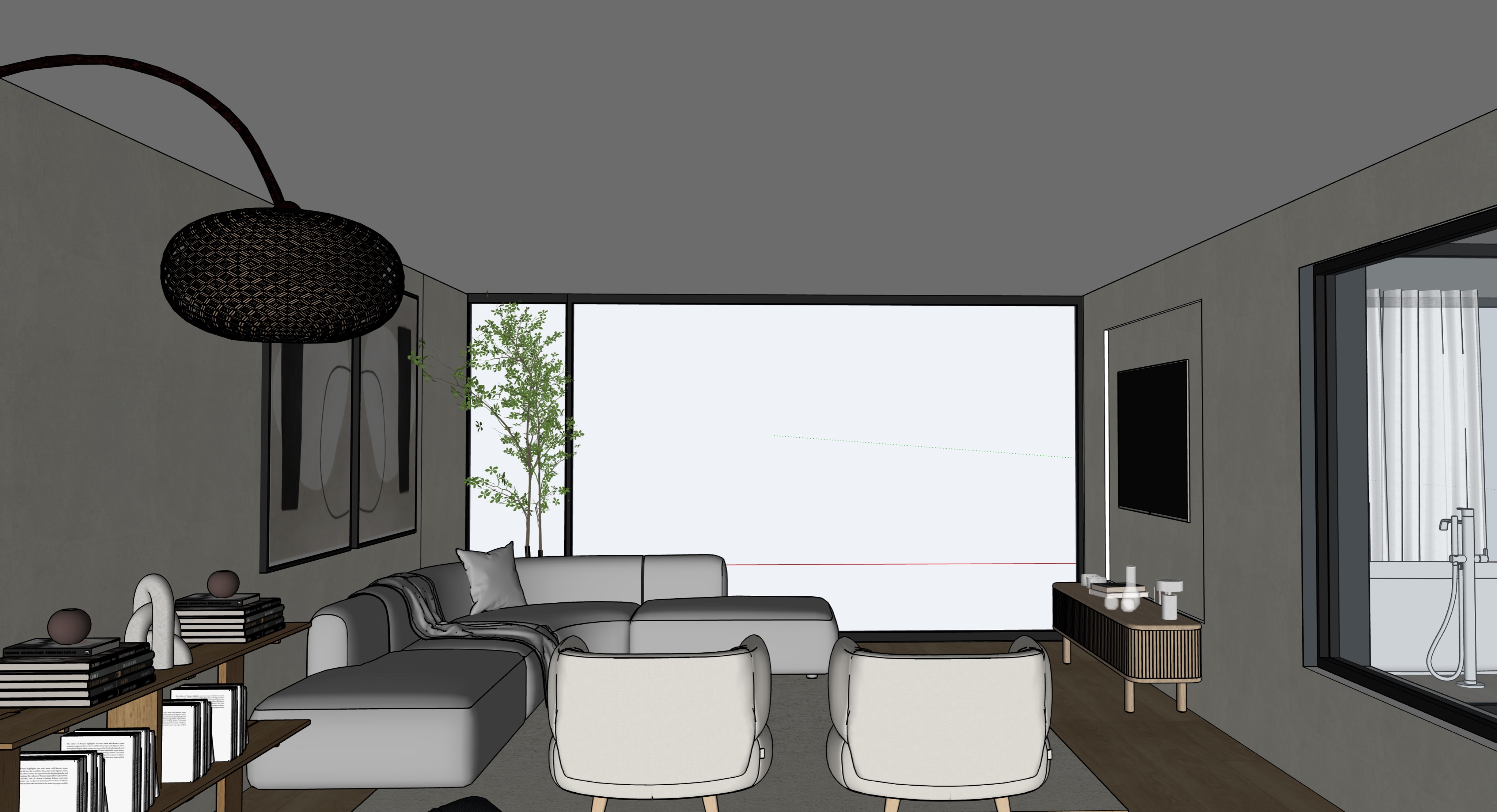 mejorar iluminaci n y generar sombras desde la ventana frontal techo blanco y paredes en limewash el fondo de la ventana que se vean copas de arboles el sill n que sea de borreguito puedes cambiar la lampara a una de metal grande