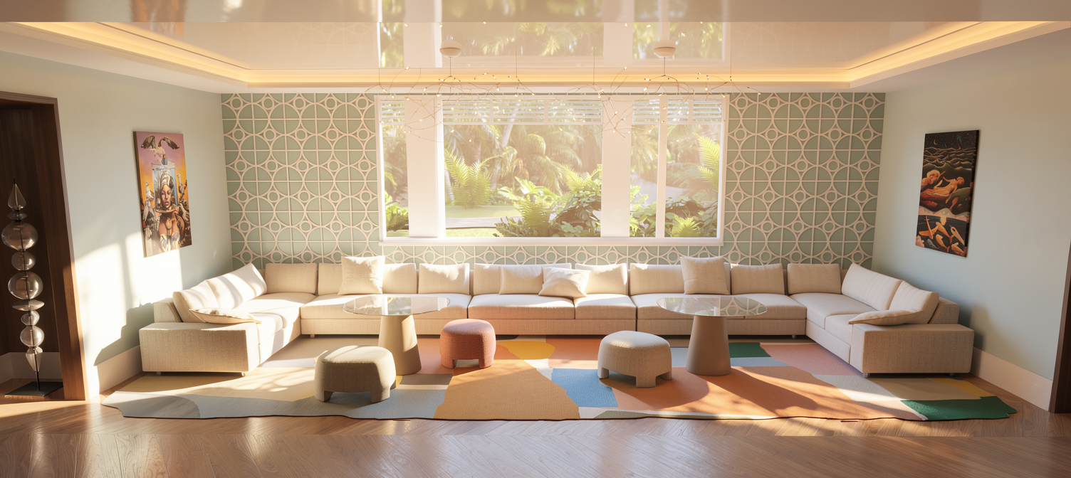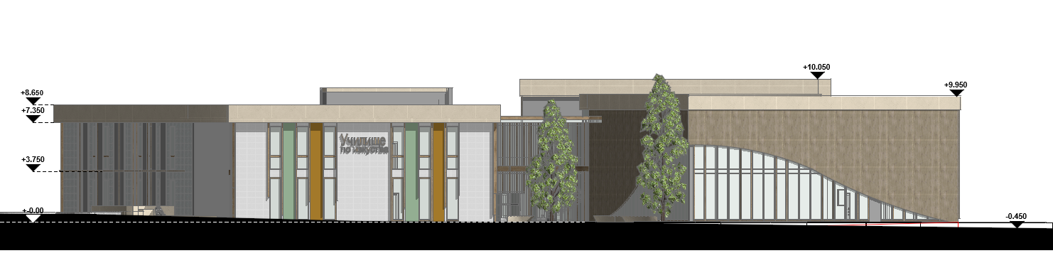 modern architectural building with a sleek and contemporary design featuring clean lines and a minimalist aesthetic the left section is clad in a dark gray facade while the middle section features alternating pastel green and orange columns against a light gray wall the right section showcases a curved wooden textured facade there are windows throughout with a subtle reflective sheen add three lush green trees in front enhancing the modern look the atmosphere is calm and serene with soft diffused daylight highlighting the textures and colors