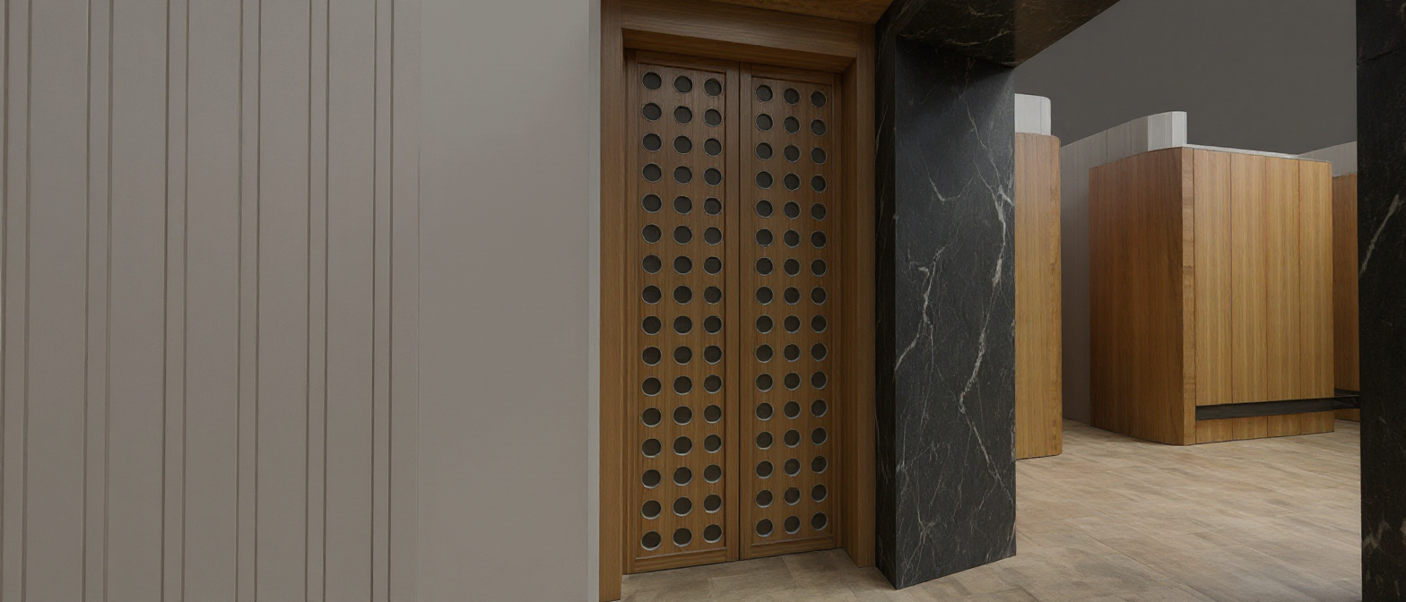 this is a bathroom two square sinks with a floating vanity light stone fronts and a long horizontal mirror maintain the light beige wall texture the wood door in the center and the glass shower enclosure on the right on the left keep the open shelving and dark cabinetry the floor is the same texture as the one on the sinks there is a recessed skylight on the ceiling use realistic materials soft daylight subtle reflections on the mirror and glass and a clean modern atmosphere