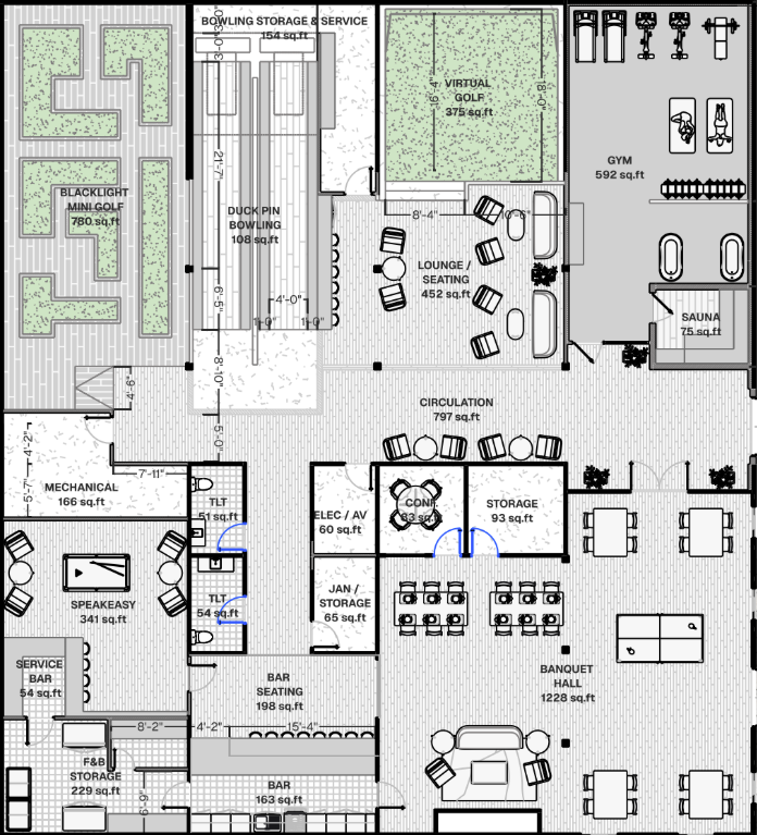 this is a new amenity space we are building for a new hotel all of these spaces are brand new and it includes a gym sauna space a virtual gold simulator a duckpin bowling a blacklit mini gold a speakeasy bar a main bar and a banquet hall for weddings and events with a fire place and lounge seating spaces render this plan using realistic materials and shadows and making the furniture look in 3d use the moodboard attached for materiality and colors keep the image orthographic but add shadows to make the furniture and walls stand out to make it appear in 3d