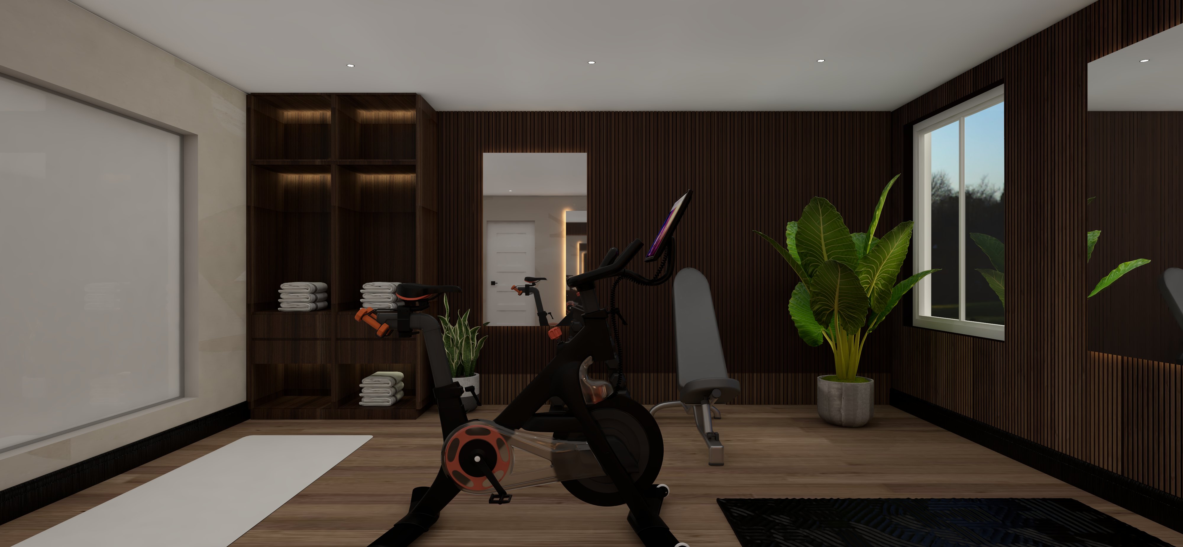 generate a realistic rendering of this home gym do not change the textures furniture or anything else just enhance it and make it more realistic add led to the mirrors the mat should be black rubber add gym decor to the bookcase