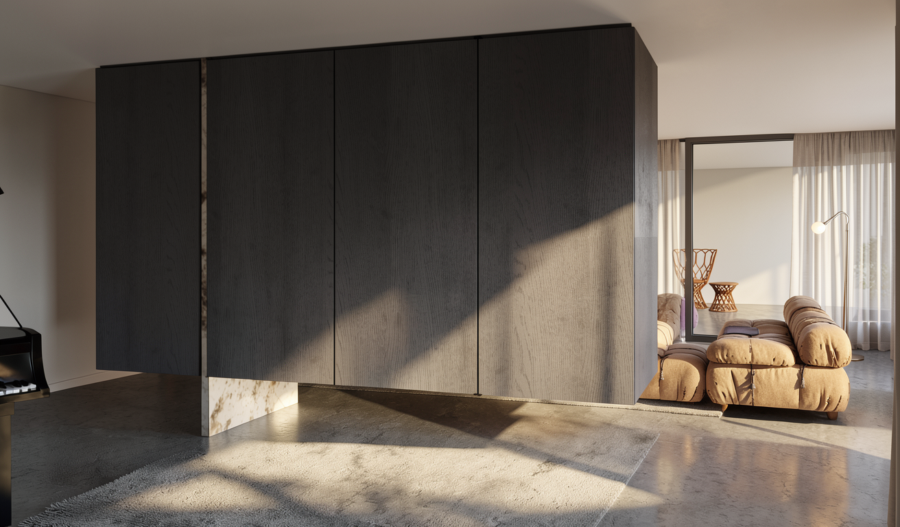 modern exterior shot white walls and with 8 grey awings in each balcony and 4 parking with cars at the ground level inside the building architecture