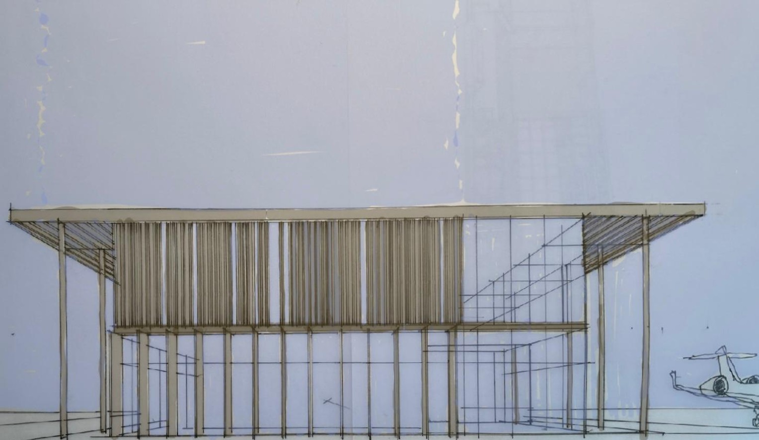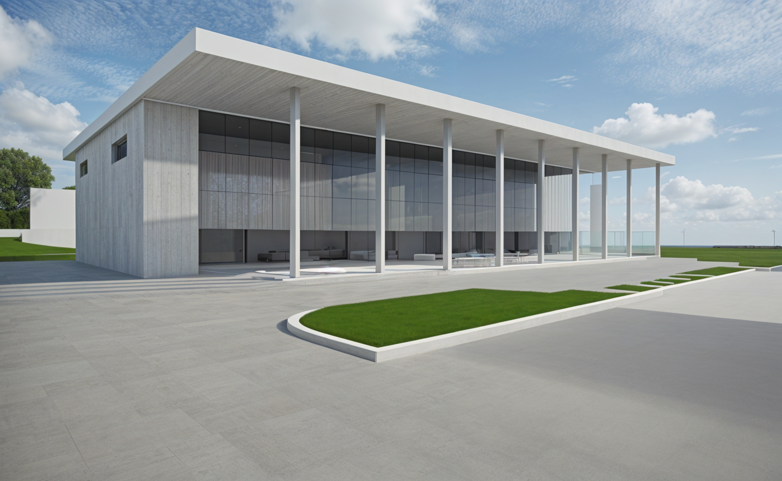 exterior shot render a modern architectural building with sleek glass facades steel columns and a distinctive cube like shape emphasize a minimalist and futuristic design incorporating palm trees in the foreground and an expansive sky above use a palette of steel gray transparent glass with reflections and lush green for the surrounding vegetation create an atmosphere of innovation and elegance capturing the essence of a cutting edge architectural marvel bathed in natural sunlight