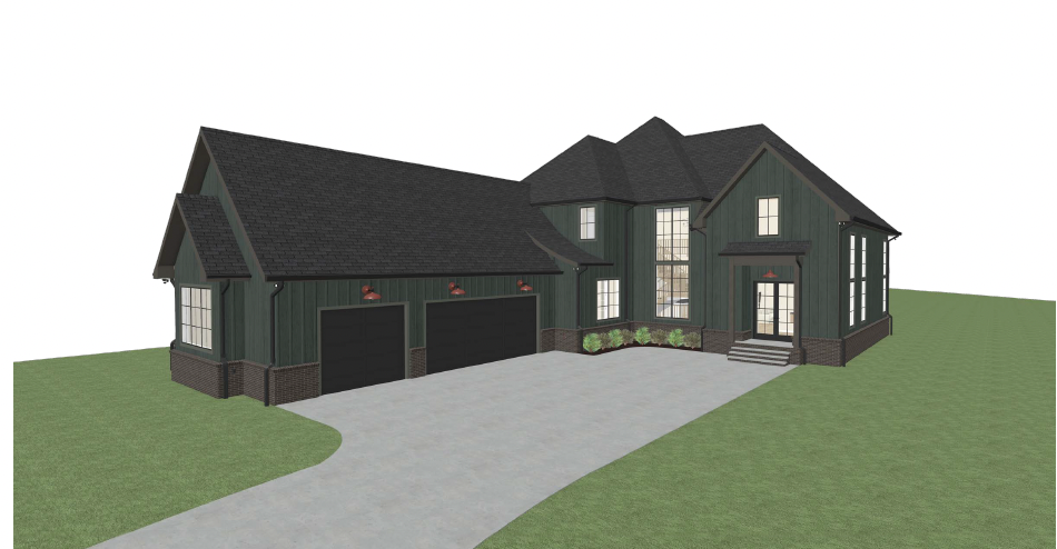 render this modern transitional luxury home change the exterior color of the vertical board and batten to a creamy white add light shrubs and flowers around the sides keep the windows and gutters and trim black add realism change the front doors to be walnut color wood with half glass change the entry pillars to the same wood add a few trees to the lot behind the house