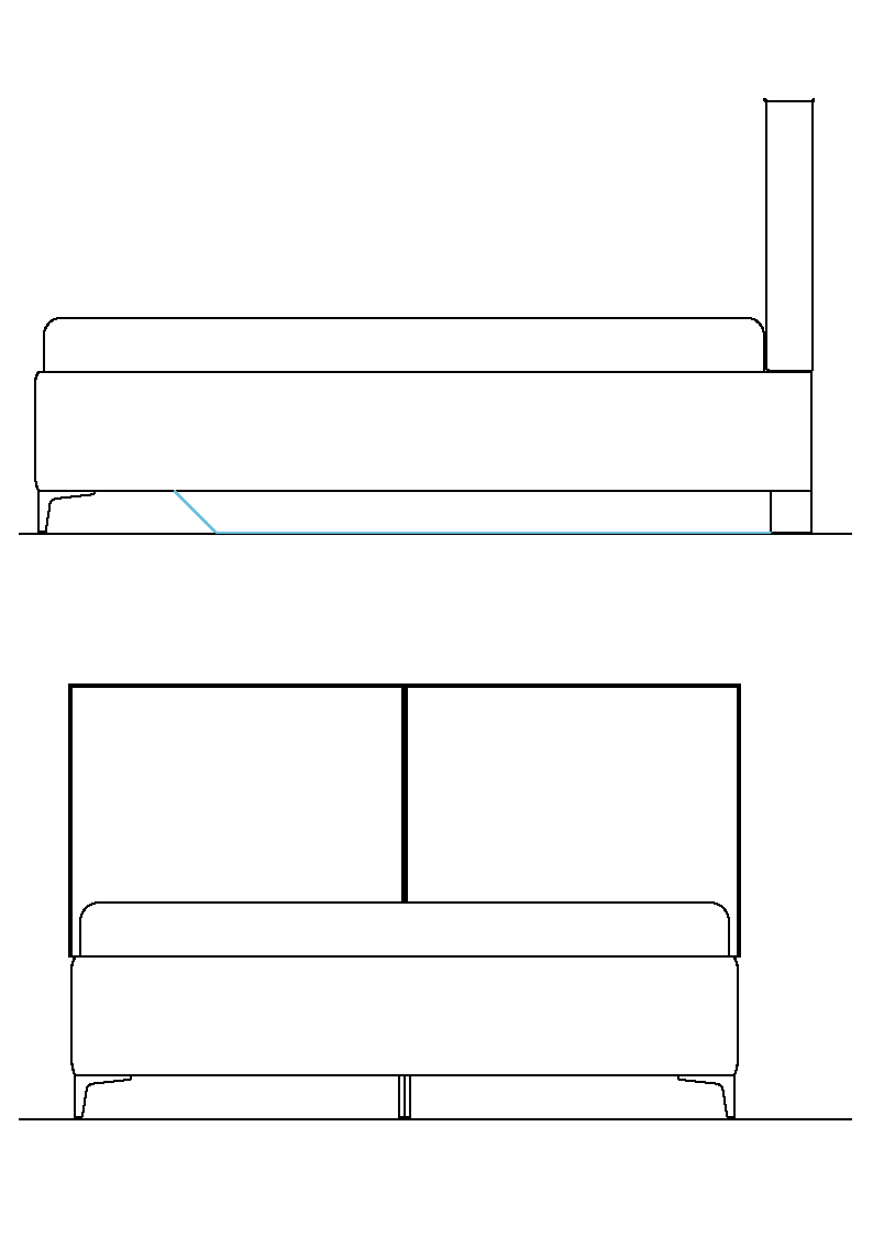 use the uploaded front and side elevation sketches as strict geometry reference show the bed in a 2d front elevation view directly facing the headboard maintain all proportions and outlines exactly as drawn headboard made of two large square upholstered cushions side by side like two pillow blocks each cushion thick and softly padded with foam and wadding slightly rounded corners and subtle fabric creases no hard flat surface thin 5 mm piping running all around the perimeter of each cushion simple upholstered bed base and side rails matching the sketch bed feet should be visible and made of shiny silver chrome metal use the uploaded flat color sample as the exact fabric color medium muted green slightly desaturated soft matte velvet like fabric add a simple white or light grey mattress with softly rounded edges render the bed in a simple bedroom interior light neutral walls natural oak wooden floor with matte finish planks minimal decor keep the bed as the main focus neutral soft lighting no extra furniture or clutter realistic materials and subtle shadows do not invent or modify any elements that are not in the sketches maintain the original front elevation view without perspective changes
