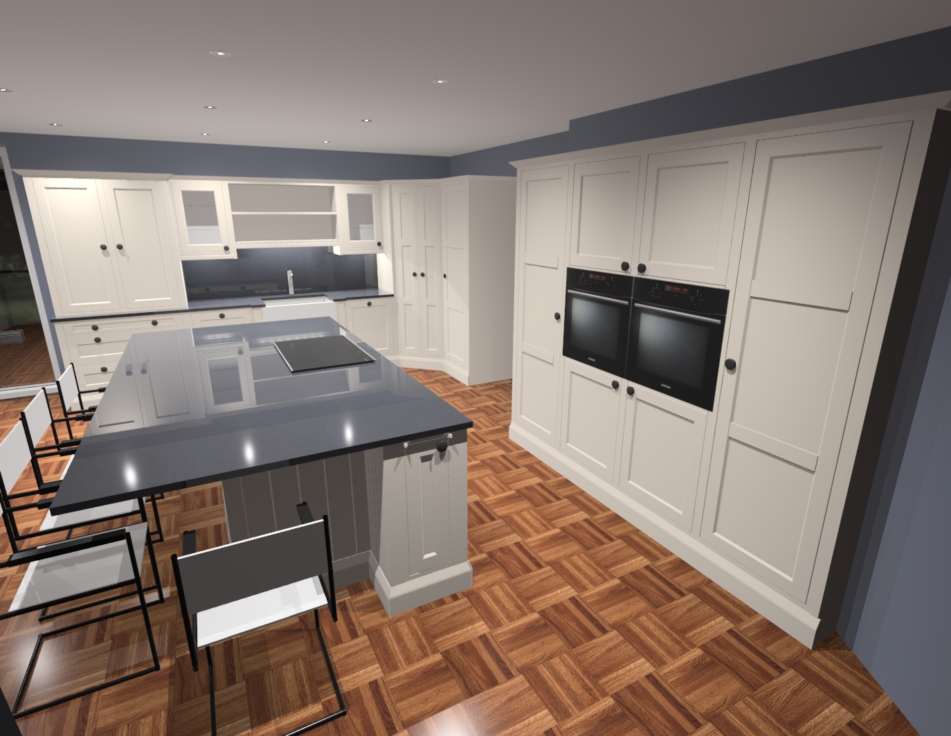 use mainly spotlighting and under unit lighting not natural light make stool into beige fabric worktops to be grained marble effect pans on the hob and books and plates on the shelves make floor herringbone maintain all wall untis as shown