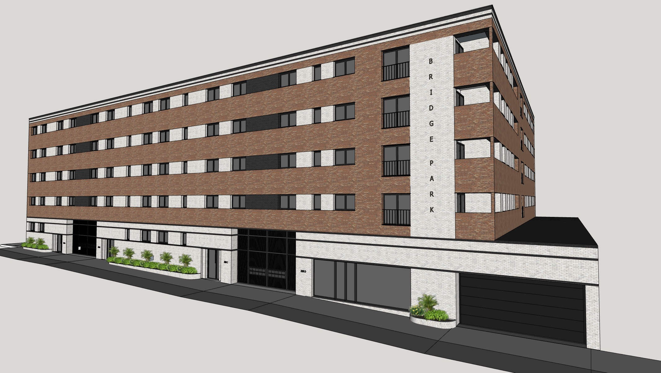 natural light and shadows in afternoon building facade is in bricks windows frames are satin black with reflections of other buildings in the window glass make more realistic vegetation