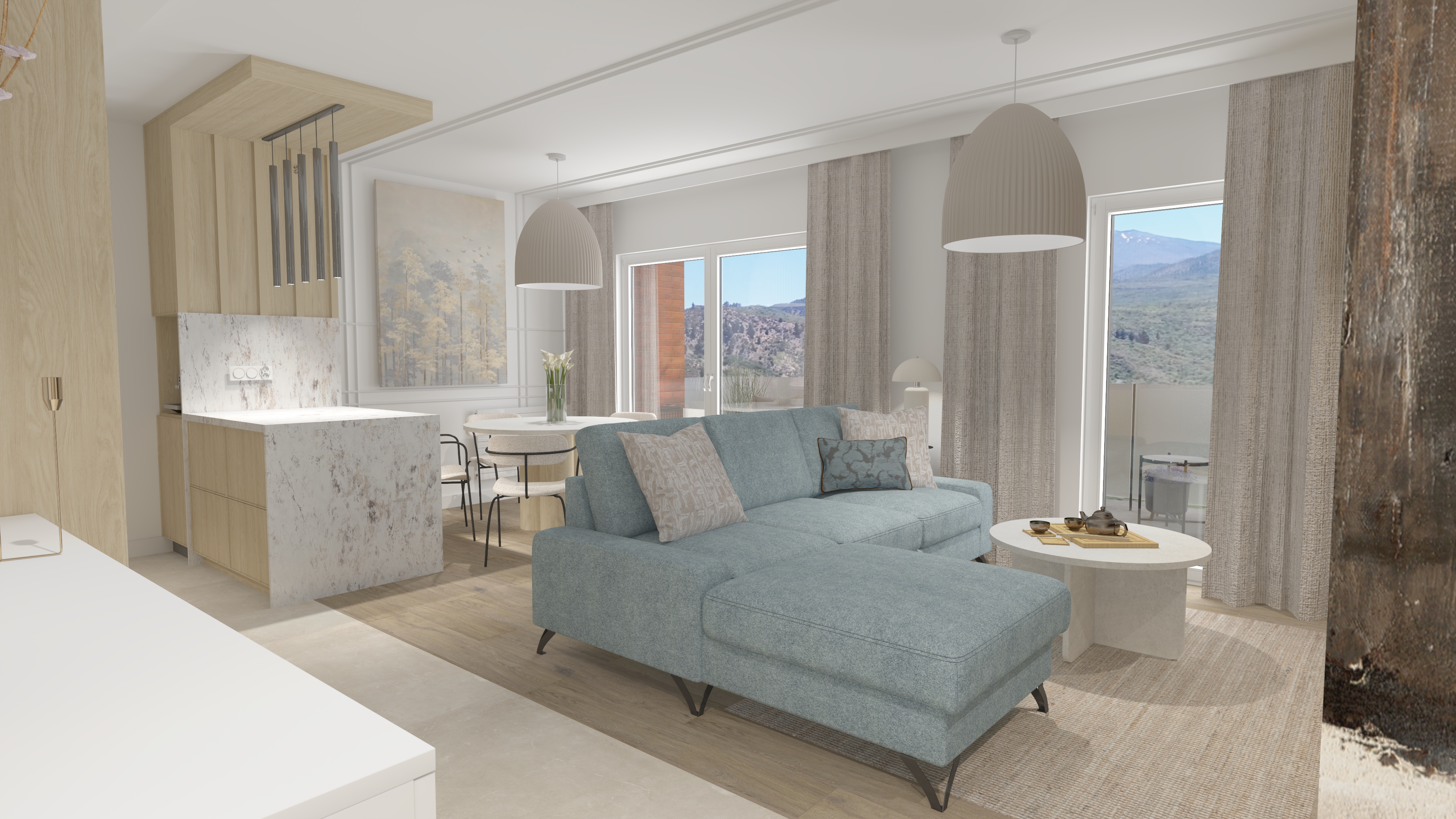 create a beautifully rendered image of a modern living room in a bright and airy atmosphere the room features a light wood floor with a soft natural grain the centerpiece is a comfortable textured teal sectional sofa adorned with patterned beige and soft blue pillows a cream colored oval coffee table rests on a woven beige rug the walls are painted in a warm light grey large windows with sheer textured beige curtains allow sunlight to illuminate the space and offer a view of a mountain landscape with clear blue skies in the dining area a round white marble table is surrounded by sleek black metal chairs with cream cushions a light wood kitchen island with a white and grey marble countertop blends naturally into the environment oversized pendant lights with soft grey shades hang from the ceiling providing a cozy intimate glow the atmosphere is calm inviting and elegantly minimalistic architecture