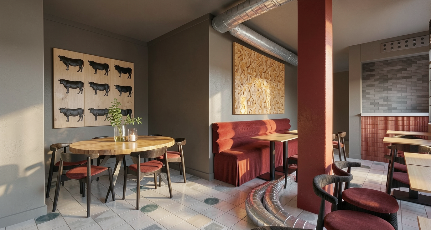 crea una imagen fotorealista de esta sketchup realza las texturas el tubo gris es un conducto de aire los ladrillos de atras son negros ilumina las vacas del cuadro
